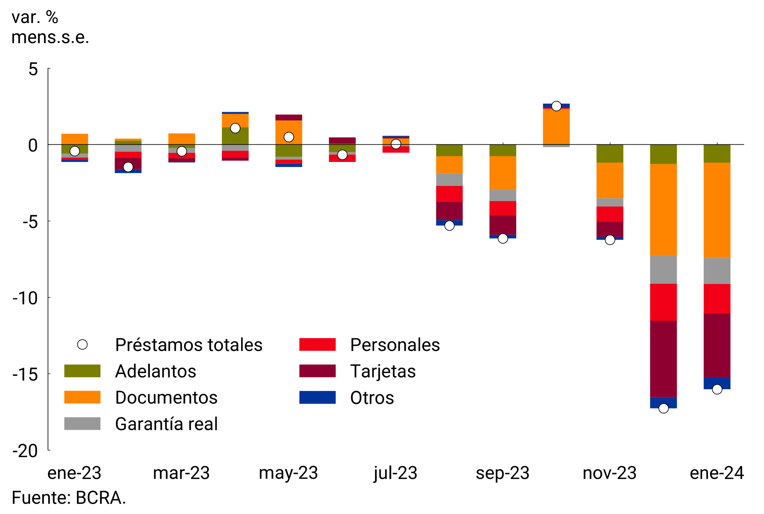 Las líneas comerciales habrían mostrado una fuerte disminución, con una caída mensual de 18,0% s.e. en términos reales y se ubicarían 37,4% por debajo del nivel de enero de 2023. Por instrumentos, los préstamos otorgados mediante documentos se habrían contraído 20,7% s.e. en el mes y se encontrarían cerca de 35% por debajo de su nivel de un año atrás, con caídas tanto en los documentos a sola firma, de mayor plazo promedio, como en los documentos descontados. Por su parte, los adelantos se habrían contraído un 11,1% s.e. mensual, acumulando una caída de 40,5% en los últimos doce meses.