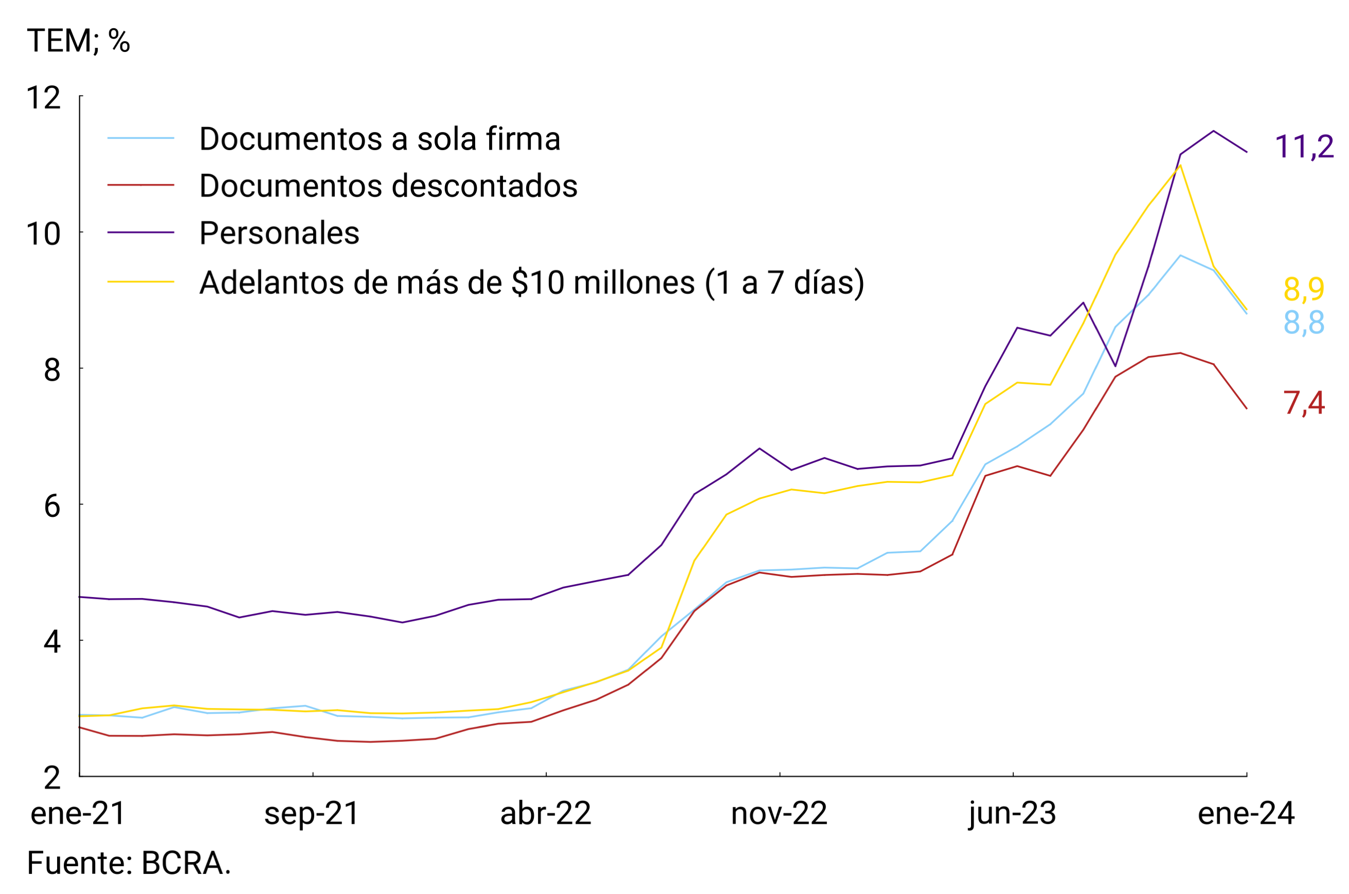 Por último, cabe mencionar que las tasas de interés activas presentaron un descenso a partir de mediados de diciembre del 2023, acompañando la caída de las tasas de interés de mercado de corto plazo que sucedió a la baja de la tasa de interés de los pases pasivos de las entidades financieras. Así, en promedio, la tasa de interés por adelantos de más de $10 millones (1 a 7 días) se ubicó en enero en 8,9% e.m., lo que implicó una caída de 0,6 p.p. respecto al registro de diciembre. Por su parte, las tasas de interés de los documentos descontados y a sola firma registraron en el mes una caída de magnitud similar, siendo más acotada en el caso de los préstamos personales (ver Gráfico 5.3).
