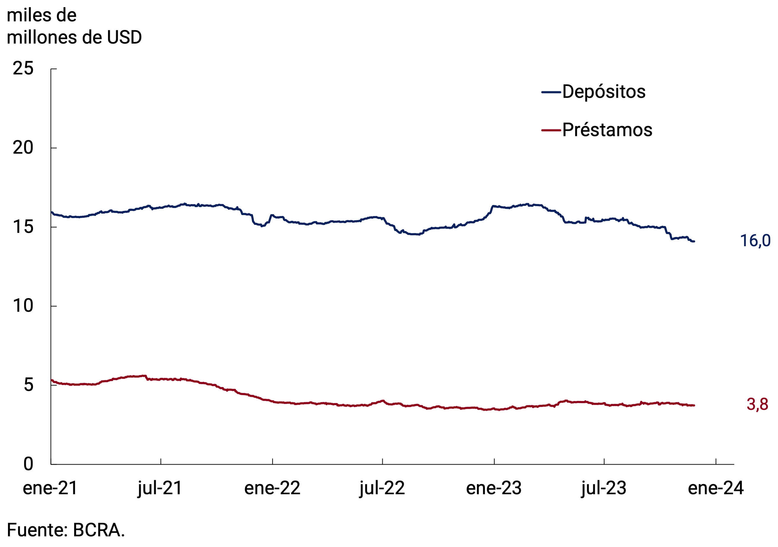 En el segmento en moneda extranjera, los principales activos y pasivos de las entidades financieras presentaron variaciones acotadas. Por un lado, los depósitos del sector privado registraron una suba de USD213 millones desde fines de diciembre y finalizaron enero con un saldo de USD15.958 millones. Por otro lado, el saldo de los préstamos al sector privado aumentó USD418 millones, ubicándose al cierre del mes en USD3.824 millones (ver Gráfico 7.1).