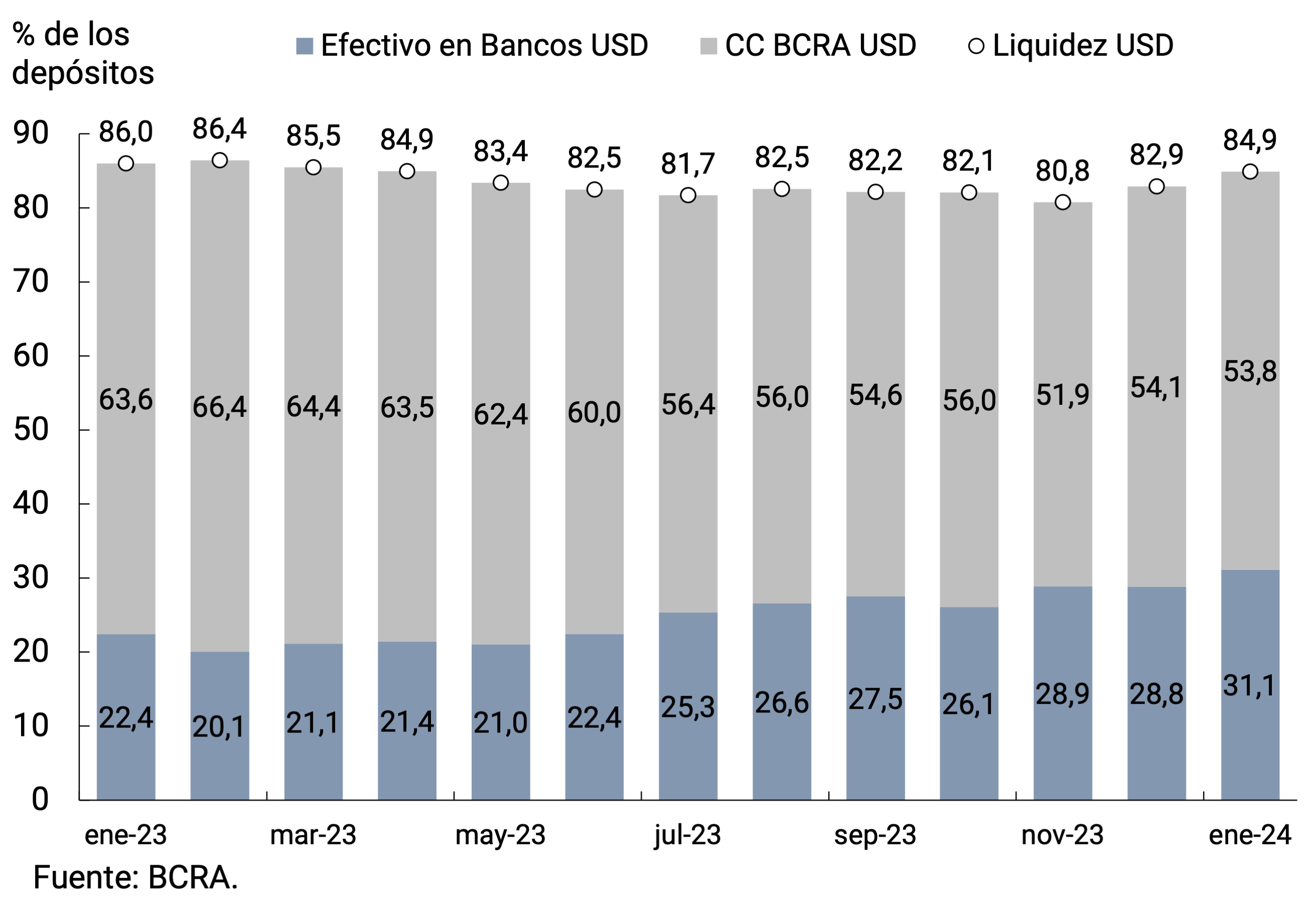 5 Incluye el efectivo en bancos, las cuentas corrientes en el BCRA, los saldos de pases netos concertados con el BCRA, las tenencias de LELIQ y NOTALIQ y los bonos públicos elegibles para integrar encajes.
