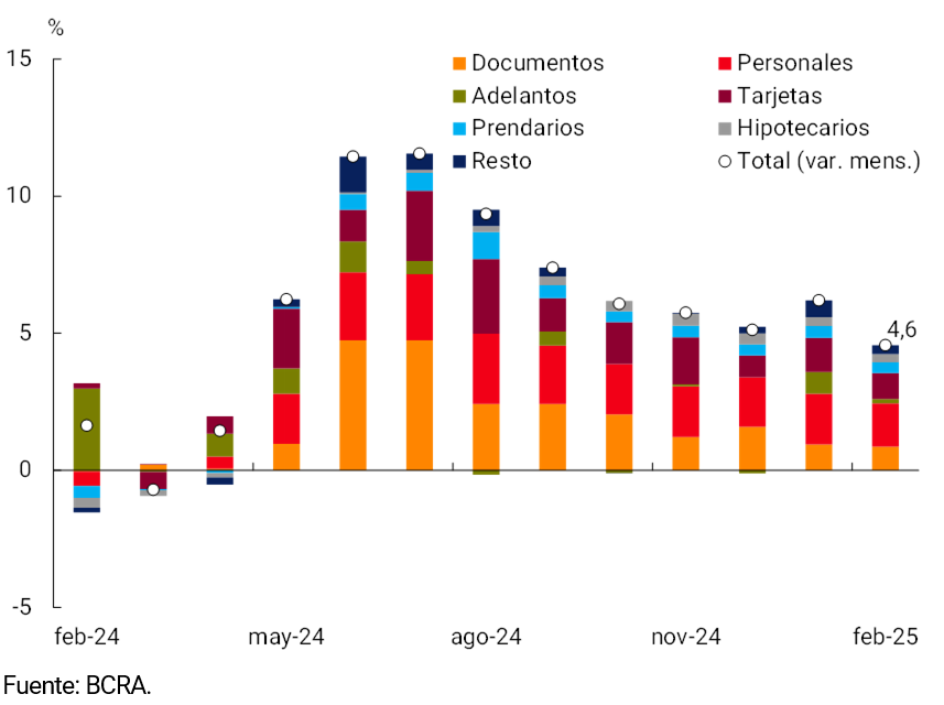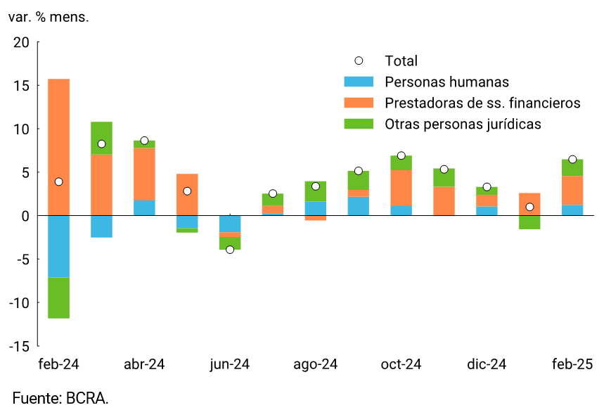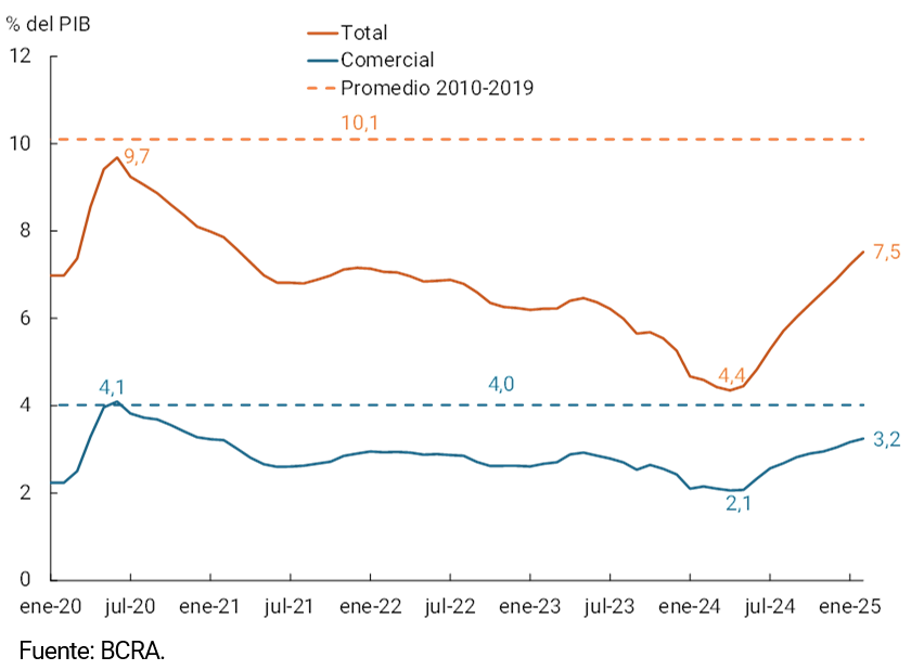 Los préstamos en pesos al sector privado registraron un aumento cercano a $2,8 billones durante febrero, consistente con un crecimiento mensual de 4,6% s.e. a precios constantes. Así, el crédito al sector privado acumula ya 11 meses consecutivos de crecimiento y un aumento de 108,0% s.e. respecto a los mínimos de enero de 2024 en términos reales. En un contexto de incipiente reintermediación, el crédito al sector privado habría alcanzado 7,5% del PIB, con un incremento de 3,1 p.p. respecto al mínimo registrado en 2024 y con un margen muy elevado para continuar en esta senda de recuperación (ver Gráfico 3.2.1 y 3.2.2).