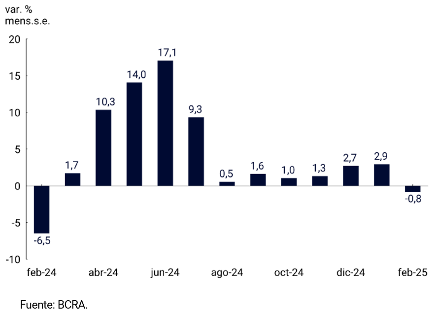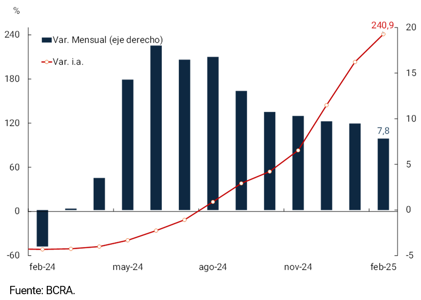 En febrero el agregado monetario amplio M3 privado1 registró una suba de 1,4% mensual a precios constantes y ajustado por estacionalidad. Así, la demanda de dinero continuó en un sendero de recuperación desde mínimos históricos. En términos interanuales, el M3 privado presentó un crecimiento real de 30,8% y como porcentaje del PIB se habría ubicado en 12,6%, 0,6 p.p. por encima del registro de febrero de 2024.