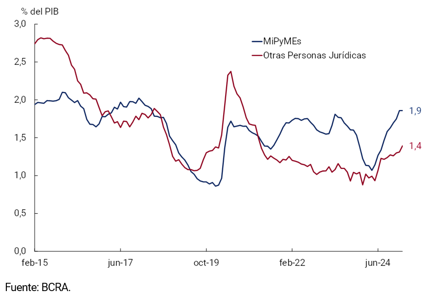 Los préstamos comerciales crecieron en términos reales 3,1% s.e. frente a enero y ya llevan 13 meses consecutivos de crecimiento, ubicándose 87,3% por encima de su nivel de un año atrás. Aquellos instrumentados a través de documentos crecieron 3,0% mensual s.e., con un aumento similar de los documentos a sola firma y los descontados, que tienen un menor plazo promedio. Los adelantos, por su parte, crecieron 1,6% mensual s.e. en términos reales y se encuentran 39,1% por encima del nivel registrado en febrero de 2024. Al analizar la evolución del crédito comercial según el tipo de deudor se observa que tanto el crédito destinado a PyMEs como el dirigido a grandes empresas crecieron en términos reales nuevamente en febrero. El crédito comercial a PyMEs habría crecido 0,5% s.e. y se habría mantenido en un nivel en torno a 1,9% del PIB, el mayor nivel de los últimos 7 años. Por su parte, los préstamos a grandes empresas habrían crecido 6,7% s.e. y 70,3% i.a., para ubicarse en 1,4% del PIB (ver Gráfico 3.2.4).