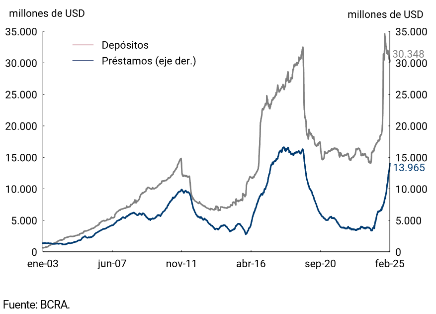 En el segmento en moneda extranjera, los depósitos del sector privado mostraron un descenso, aunque permanecen en torno a niveles máximos, mientras que los préstamos en moneda extranjera presentaron un sostenido crecimiento. Cabe señalar que el BCRA decidió flexibilizar las condiciones para otorgar préstamos en moneda extranjera, eliminándose la prohibición a entidades financieras de prestar a clientes que no sean exportadores en la medida en que los fondos provengan de Obligaciones Negociables o líneas de financiamiento del exterior.
