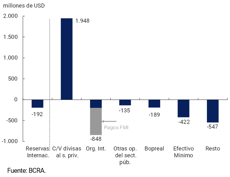 Las Reservas Internacionales del BCRA finalizaron febrero con un saldo de USD28.117 millones, lo que implicó una caída de USD192 millones respecto al mes previo. El efecto de la compra neta de divisas al sector privado, que dejó un saldo de USD1.948 millones, fue compensado por el resto de los factores de variación de las reservas internacionales. En particular, se destacaron pagos a organismos internacionales, incluyendo el pago de intereses y cargos al FMI por USD648 millones (ver Gráfico 4.2).