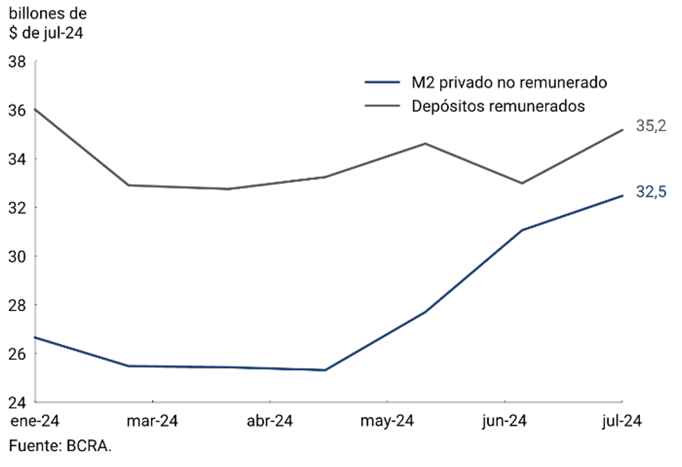 En julio la demanda de dinero continuó mostrando señales de recuperación desde niveles mínimos históricos, en un contexto de fuerte desaceleración de la tasa de inflación y cierta mejoría de los indicadores adelantados de actividad. El M3 privado presentó un aumento mensual a precios constantes y ajustado por estacionalidad, con subas de todos sus componentes. Se destaca que, mientras los medios de pago desaceleraron el crecimiento que se observó en los dos meses anteriores, los instrumentos remunerados revirtieron la tendencia del mes anterior y experimentaron una fuerte expansión.