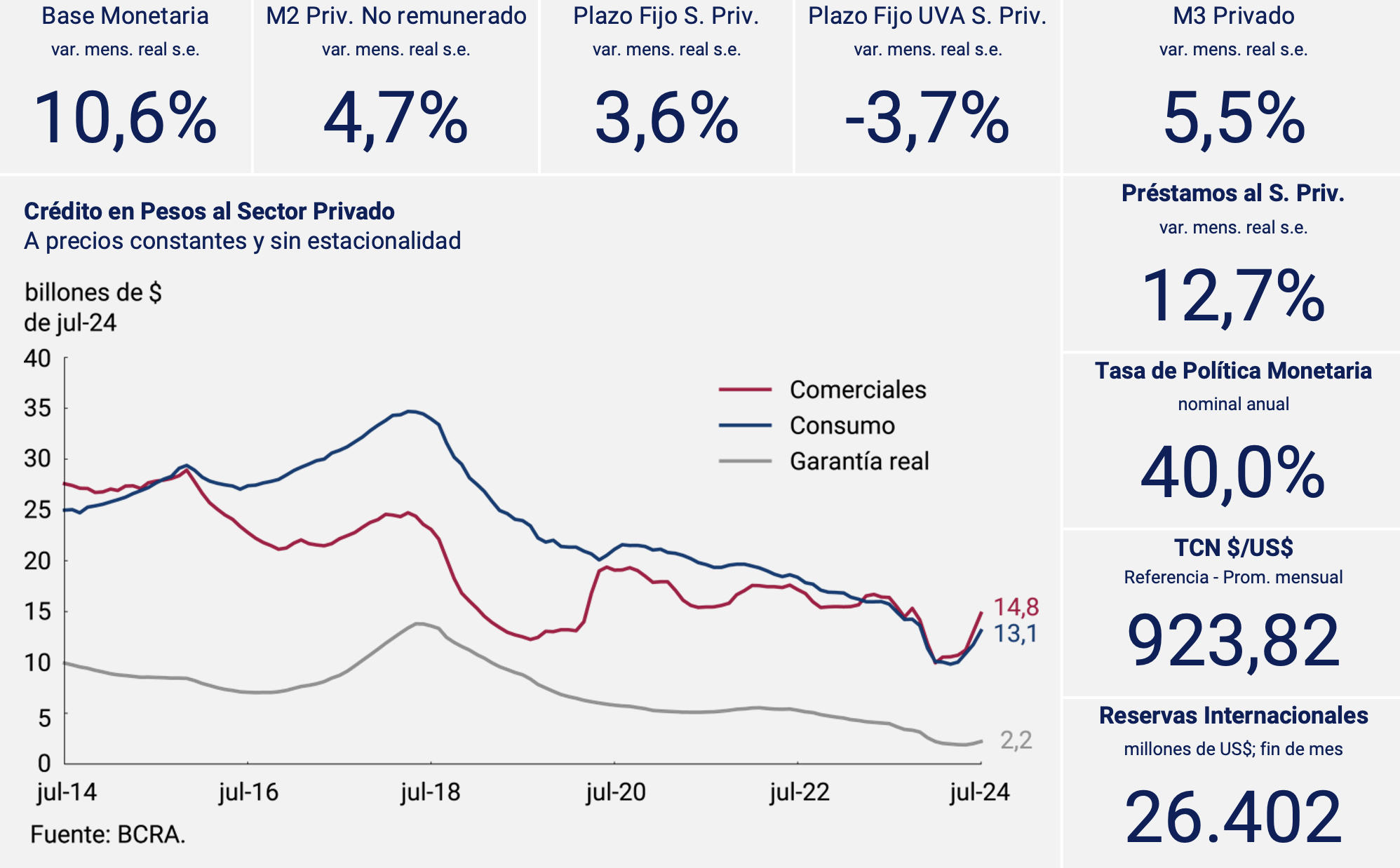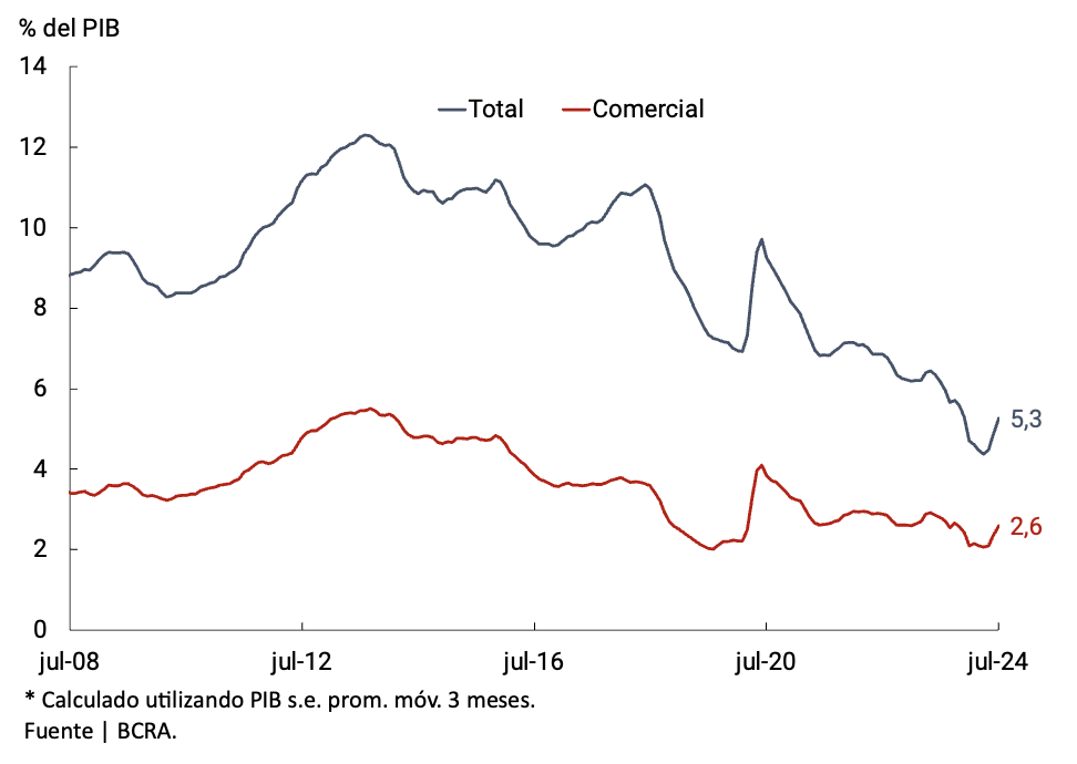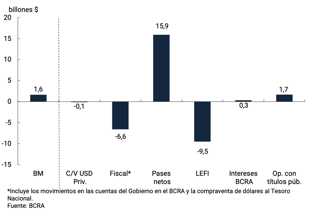Con todo, la Base Monetaria registró un aumento de 10,6% mensual a precios constantes y sin estacionalidad. De esta manera, se ubicó en 3,8% del PIB.
