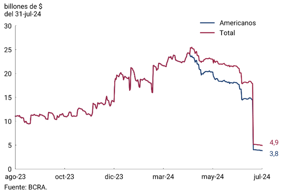 Luego de cumplimentada exitosamente una primera fase del programa de estabilización macroeconómica implementado por el Gobierno Nacional, el BCRA anunció a mediados de mes la puesta en marcha de un marco monetario orientado a consolidar el proceso de eliminación de la inflación y sentar las bases del marco normativo para la implementación de la competencia de monedas. El mismo consiste en la fijación de un máximo de pasivos monetarios del BCRA. De esta manera, se agrega como objetivo el de limitar la cantidad de pesos al monto de la Base Monetaria Amplia del 30 de abril, es decir, $47,7 billones pesos corrientes (9,1% del PIB). En línea con esta nueva etapa, el BCRA dispuso cerrar la ventana de pases pasivos a partir del 22 de julio, con el objetivo de terminar con la emisión endógena generada por estos instrumentos y dar un nuevo paso en el proceso de saneamiento del balance del banco. Con el fin de absorber los excedentes de liquidez, el 17 de julio el Tesoro Nacional emitió las nuevas letras fiscales de liquidez (LEFI) a 1 año de plazo por un monto de $20 billones y las canjeó por títulos públicos ajustables por CER en cartera del BCRA. De esta manera, los bancos pudieron colocar su liquidez comprando LEFI por un total de $10,85 billones luego de desarmar los pases pasivos. Por otra parte, el BCRA lanzó el 16 de julio una propuesta de carácter voluntario para la rescisión de opciones “PUTs” americanas y europeas sobre la cartera de títulos del Tesoro de los bancos por un valor máximo de $17,7 billones. Esta medida, junto con la eliminación de los “BIDs automáticos” sobre títulos del Tesoro, implicó el final para múltiples mecanismos de monetización indirecta del déficit fiscal que habían sido habilitados en los años previos.