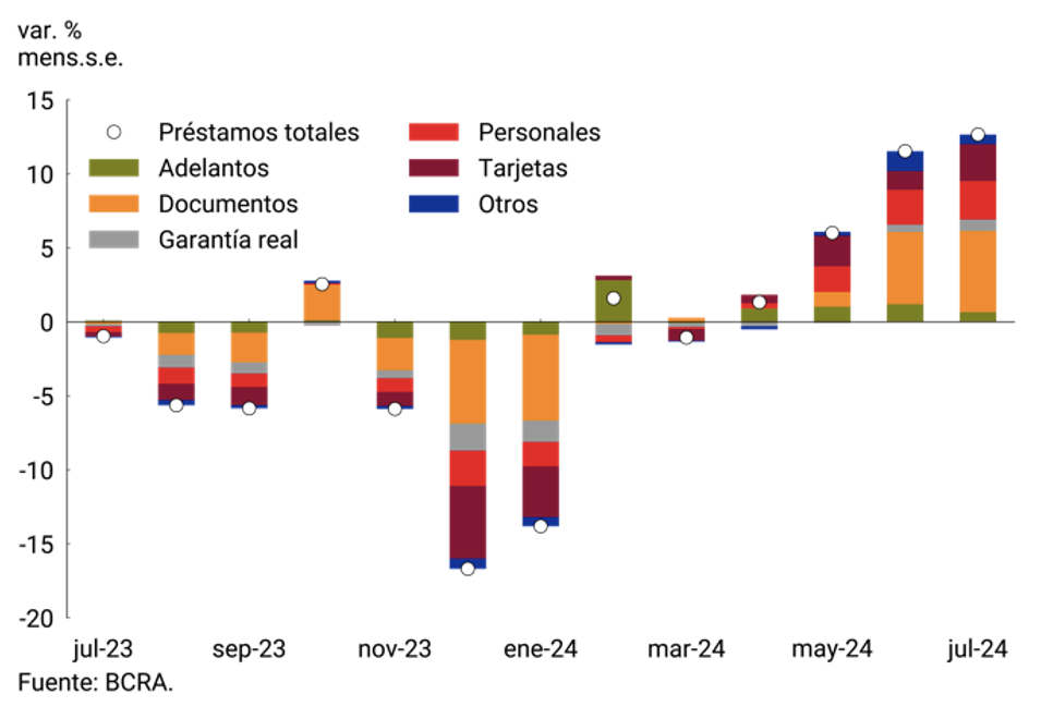 El crédito comercial registró un aumento mensual de 14,0% s.e. en términos reales, impulsado mayormente por los préstamos instrumentados a través de documentos, que crecieron 18,9% s.e. en el mes. El crecimiento de estas financiaciones fue impulsado conjuntamente por los documentos a sola firma y los documentos descontados (20,7% y 16,4% respectivamente). Los adelantos, por su parte, exhibieron una expansión mensual relativamente más modesta, de 4,5% s.e. real. Los préstamos al consumo, otro motor del crecimiento del crédito, aumentaron alrededor de 11,6% s.e. mensual en términos reales, destacándose nuevamente el fuerte aumento cercano al 18% s.e. de los préstamos personales. Este comportamiento se observó en un contexto de tasas de interés que se mantienen relativamente estables desde mediados de mayo, niveles que alcanzan a menos de la mitad de los que se registraban a comienzos de año. Otro hecho destacable es que durante julio se registró un crecimiento real desestacionalizado del crédito hipotecario por primera vez en 6 años, al aumentar 4,0% respecto a junio.