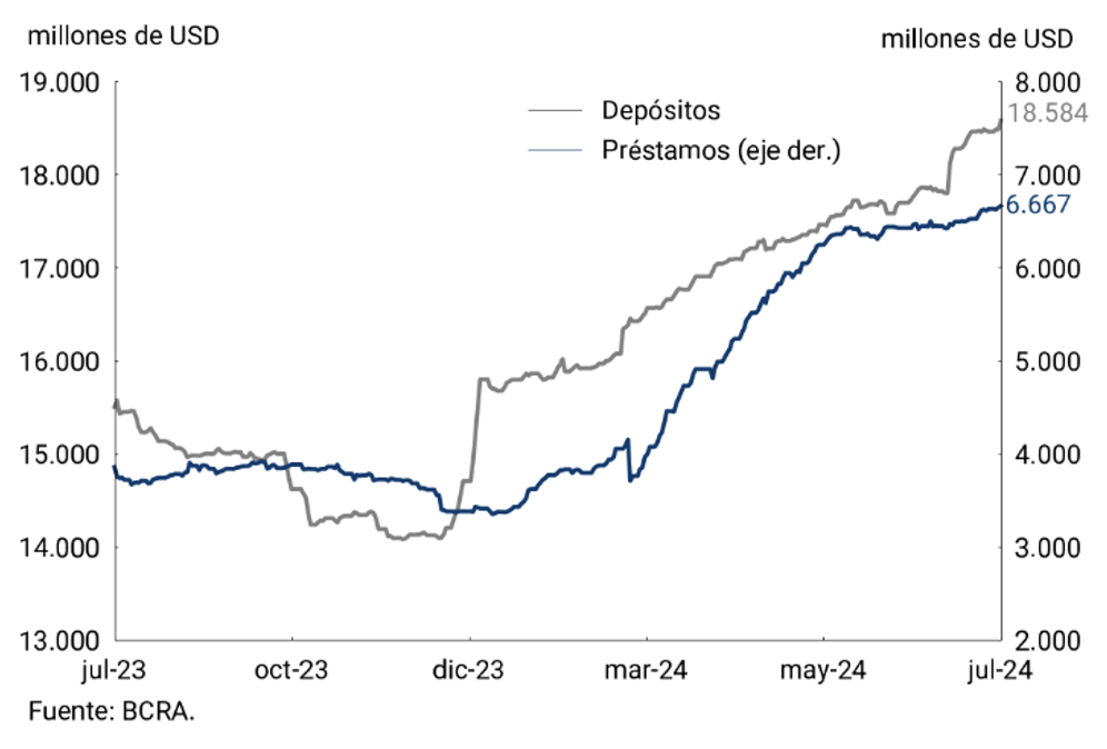 En el segmento en moneda extranjera, los principales activos y pasivos de las entidades financieras registraron aumentos. Los depósitos del sector privado presentaron una suba de USD723 millones explicada en gran parte por una operación puntual al principio del mes, y finalizaron julio con un saldo de USD18.584 millones. Por su parte, los préstamos al sector privado presentaron crecimiento modesto: unos USD200 millones respecto a fin de junio, con aumentos en los documentos a sola firma y las financiaciones con tarjetas de crédito. Así, finalizaron julio en USD6.667 millones. (ver gráfico 4.1). Desde el 10 de diciembre, los préstamos acumulan un crecimiento de más de 80%, mientras que la variación de los depósitos fue del orden del 30%.