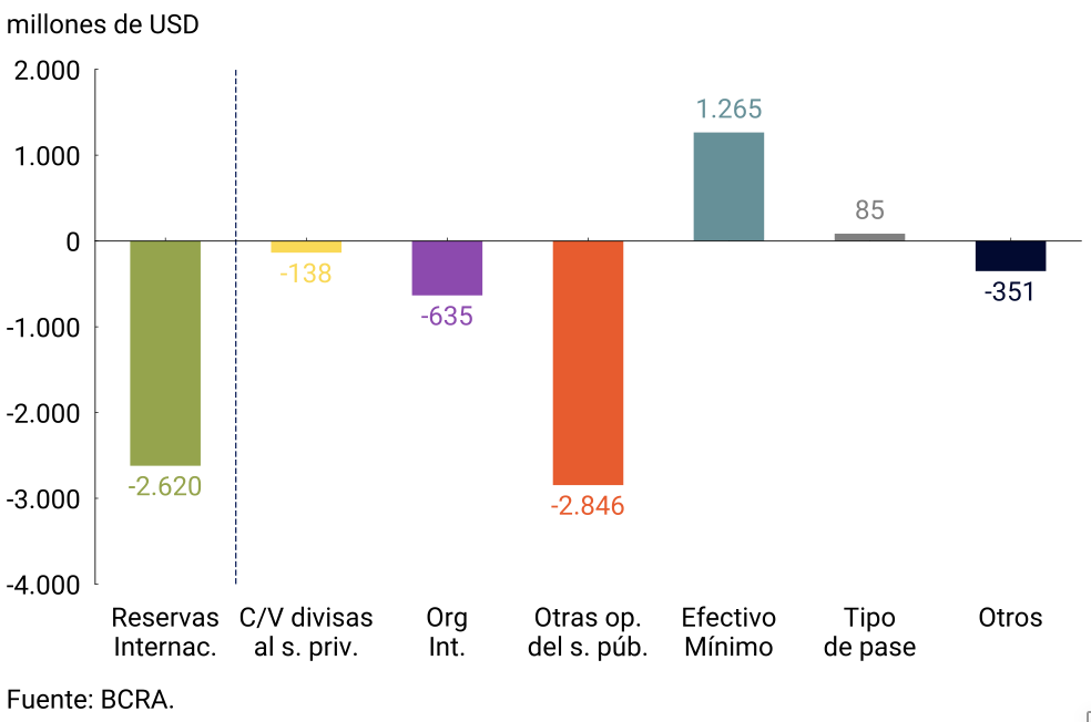 Las Reservas Internacionales del BCRA finalizaron julio con un saldo de USD26.402 millones, registrando una caída de USD2.620 millones respecto a fines de junio. Sobre esta dinámica incidió particularmente, el pago de cupones de títulos públicos en dólares por un monto aproximado a USD2.600 millones más el pago de capital al FMI por USD647 millones. Estos efectos fueron parcialmente compensados por el aumento de las cuentas de efectivo mínimo.