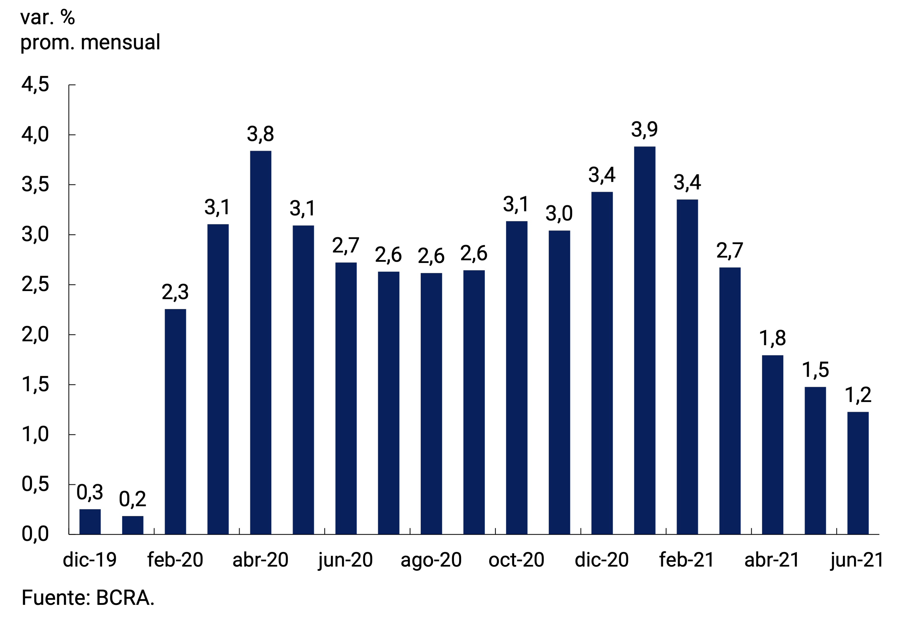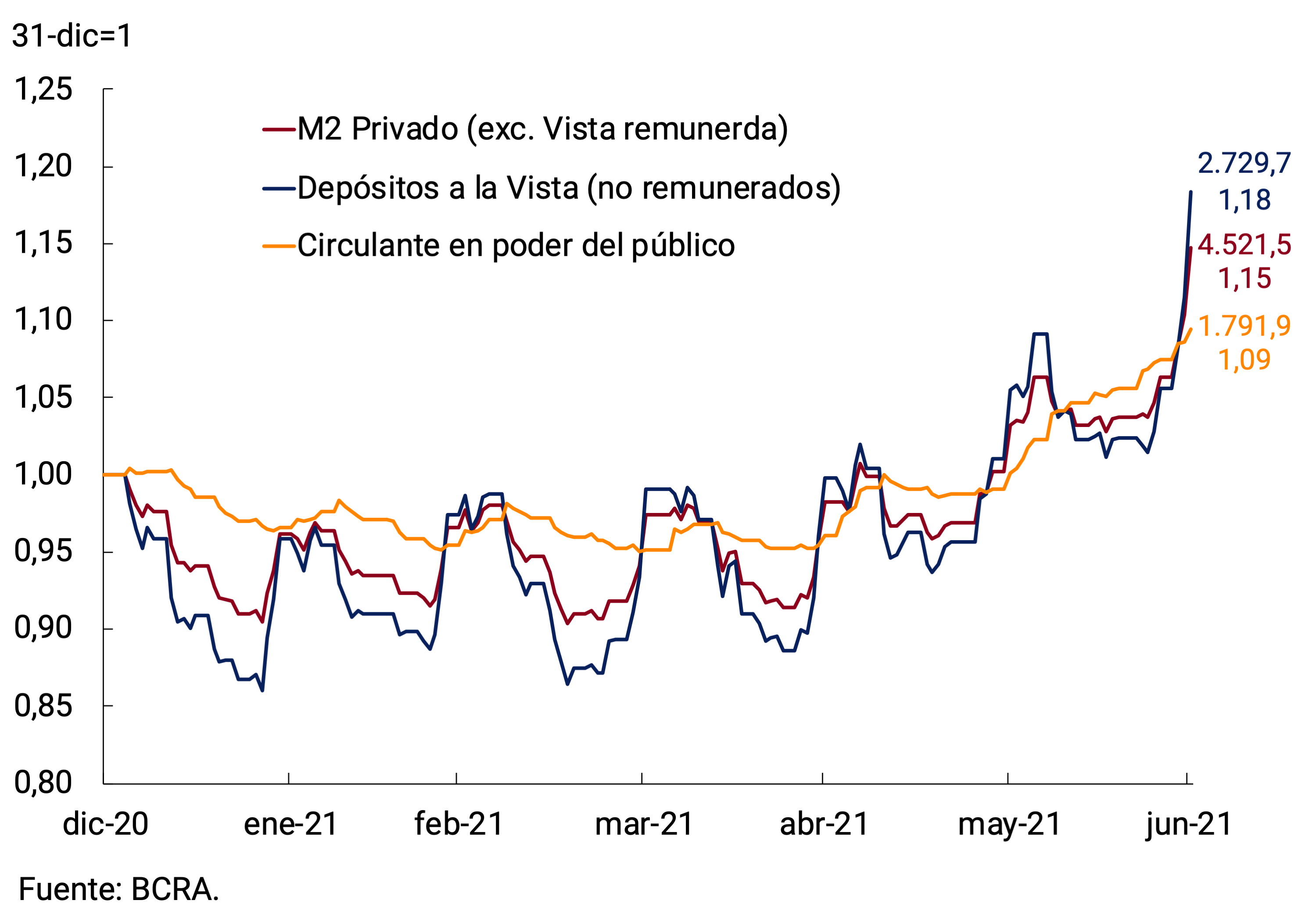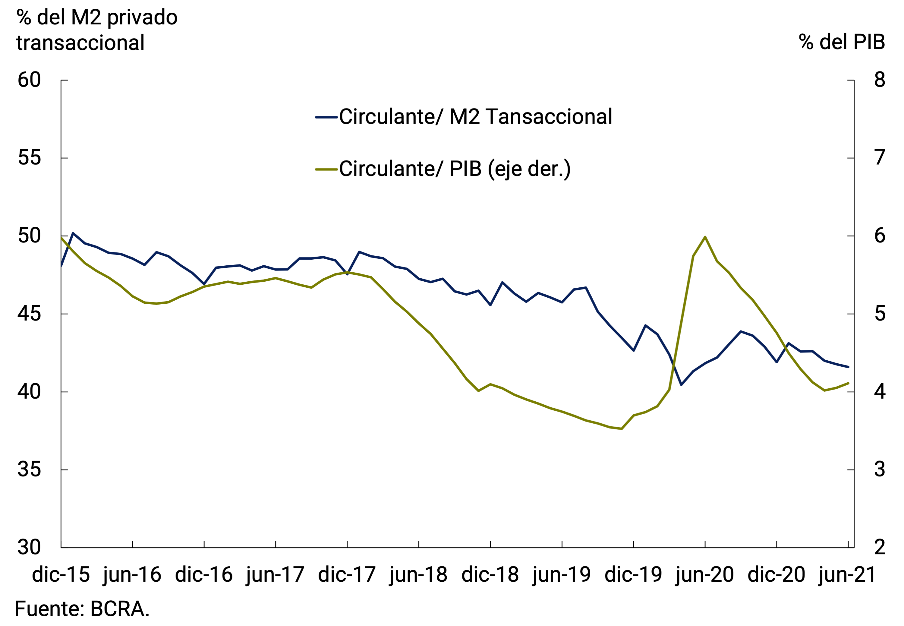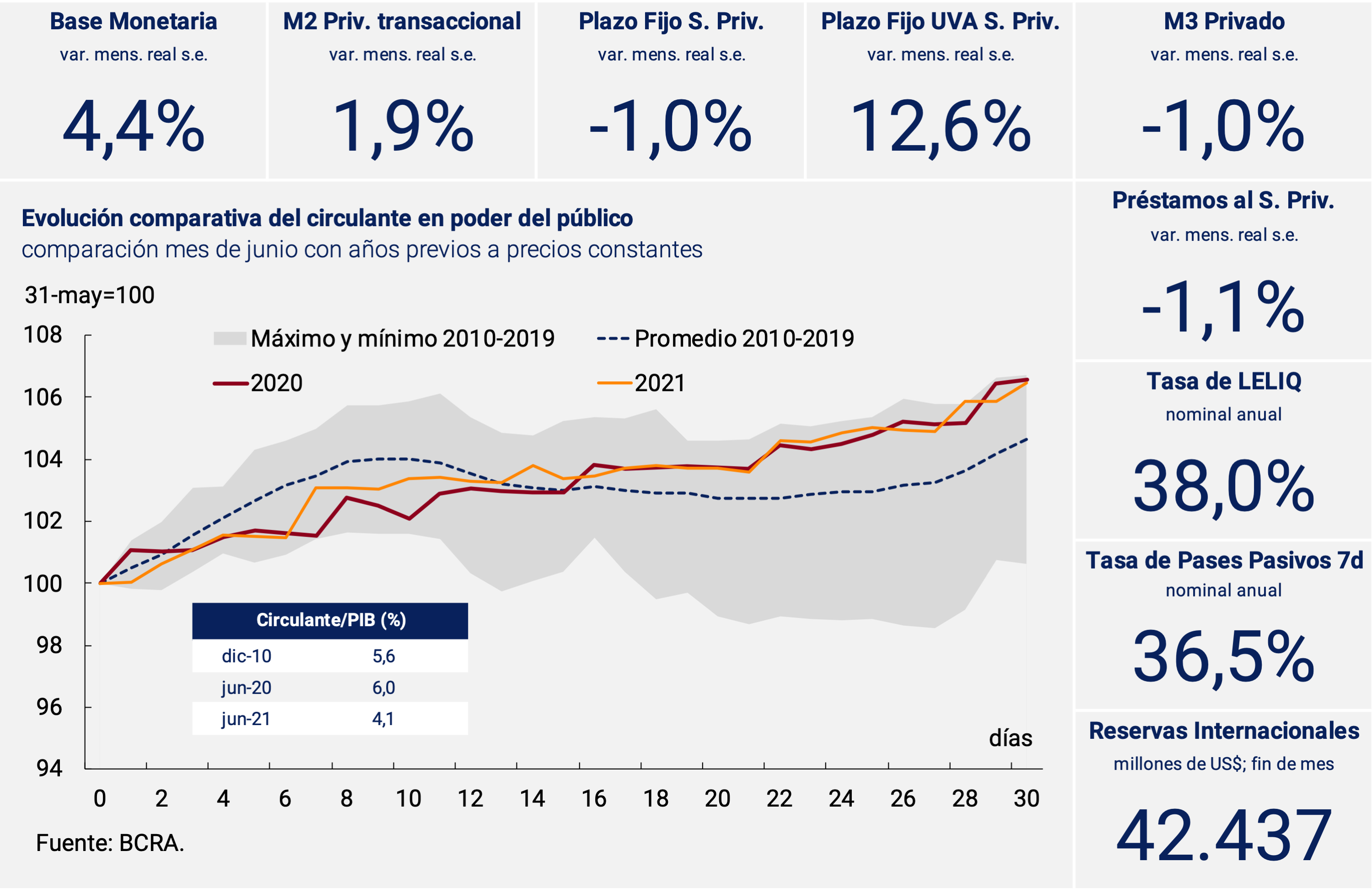 En términos reales y ajustados por estacionalidad los medios de pago transaccionales aumentaron en el mes, debido a diversos factores como la transferencia de recursos a los sectores más vulnerables y los mayores salarios debido al ingreso de tramos de ajuste de diversas paritarias. En particular, las transferencias a los sectores más vulnerables, que son demandantes intensivos de efectivo, llevaron a que la demanda de circulante fuera creciente a lo largo de todo el mes (en un período cuya estacionalidad intramensual es menos marcada por el pago del medio aguinaldo).