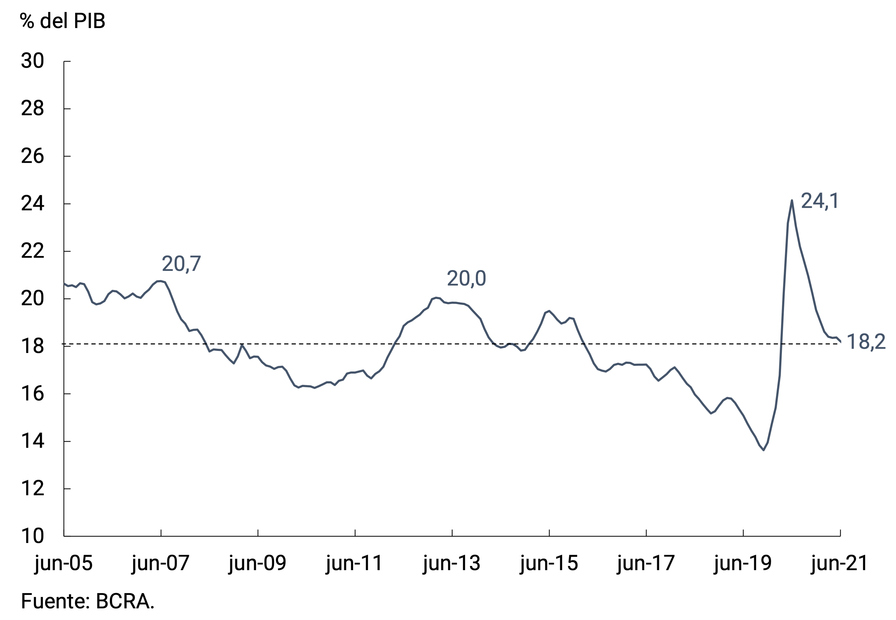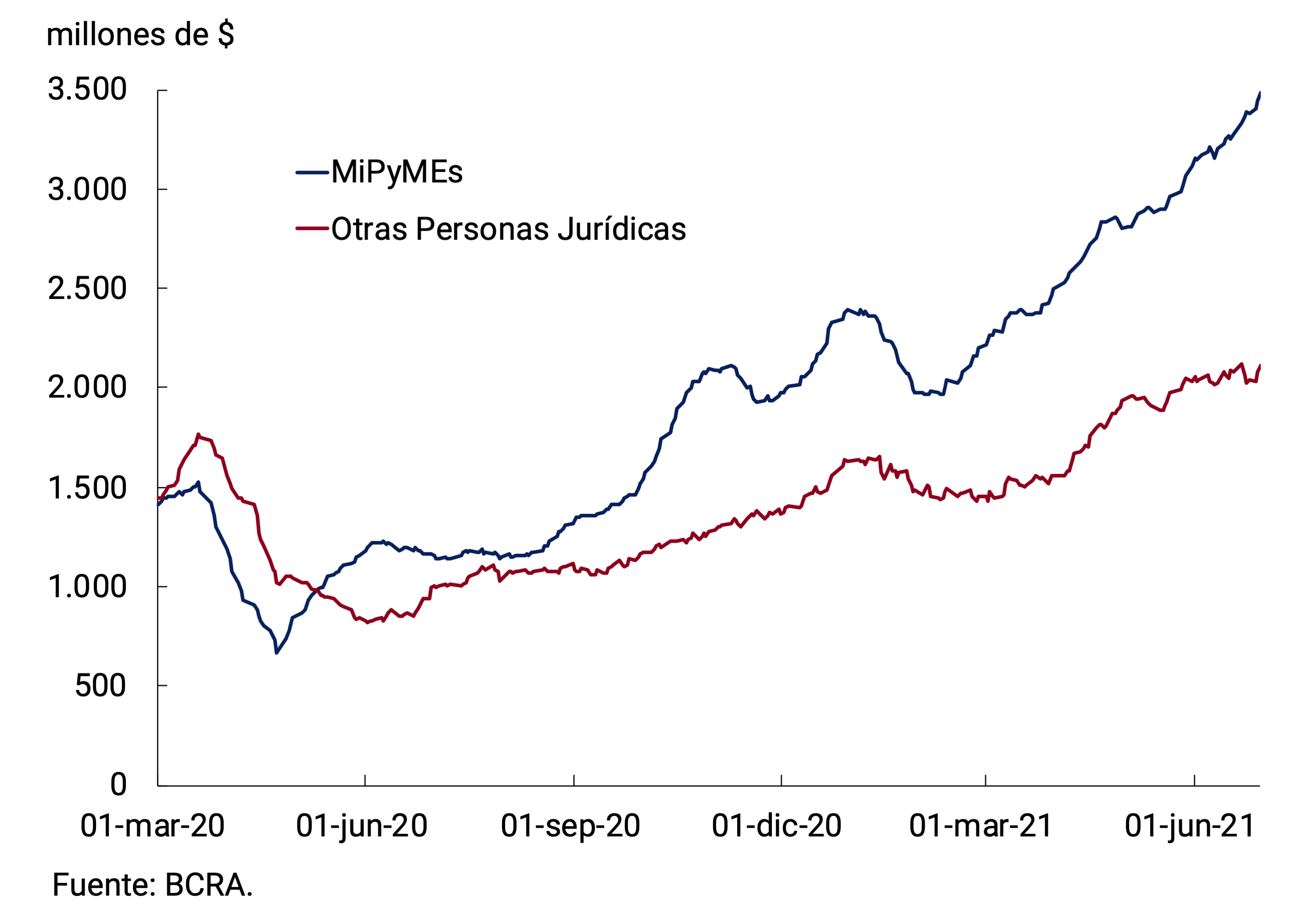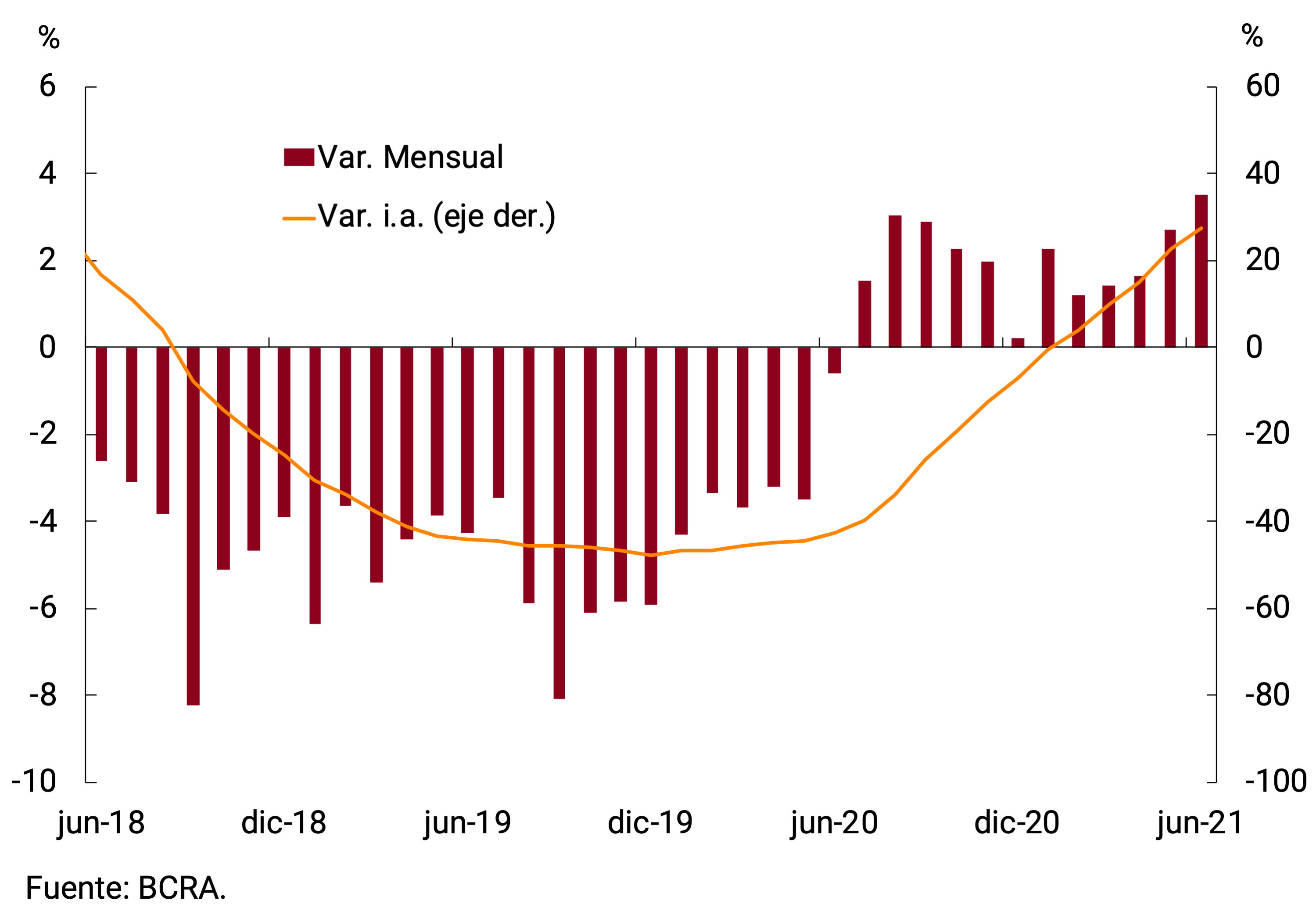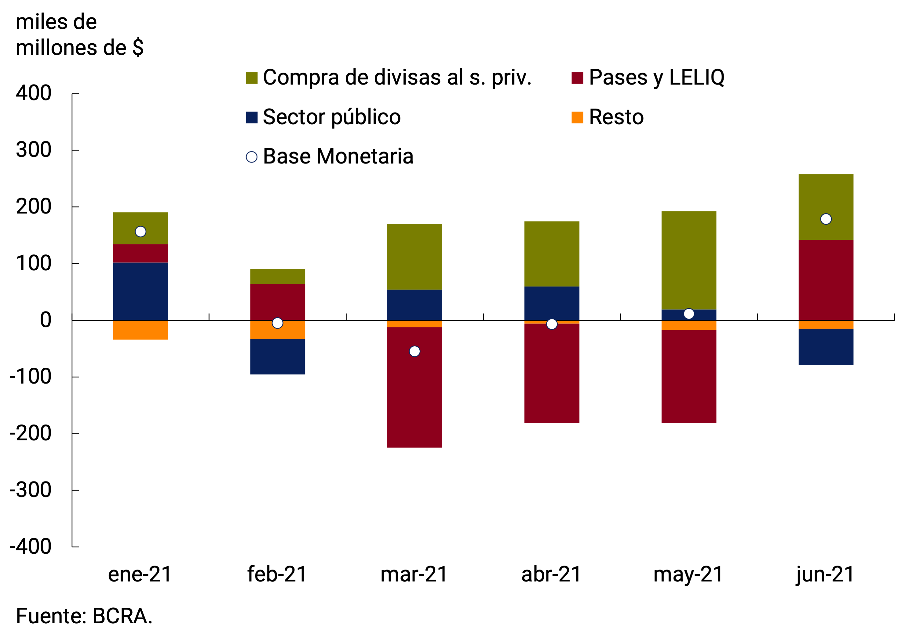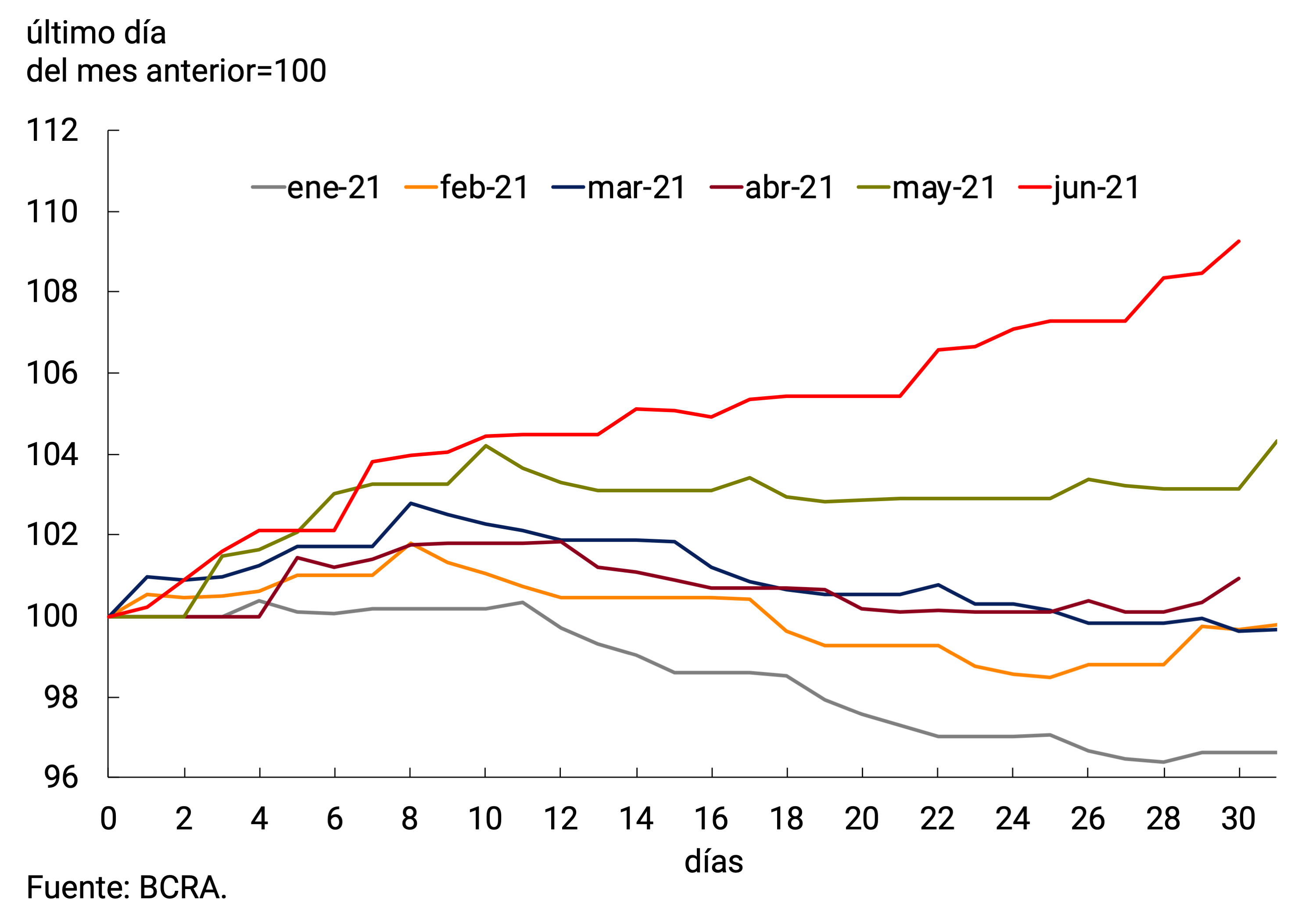 En términos reales y ajustados por estacionalidad los medios de pago transaccionales aumentaron en el mes, debido a diversos factores como la transferencia de recursos a los sectores más vulnerables y los mayores salarios debido al ingreso de tramos de ajuste de diversas paritarias. En particular, las transferencias a los sectores más vulnerables, que son demandantes intensivos de efectivo, llevaron a que la demanda de circulante fuera creciente a lo largo de todo el mes (en un período cuya estacionalidad intramensual es menos marcada por el pago del medio aguinaldo).