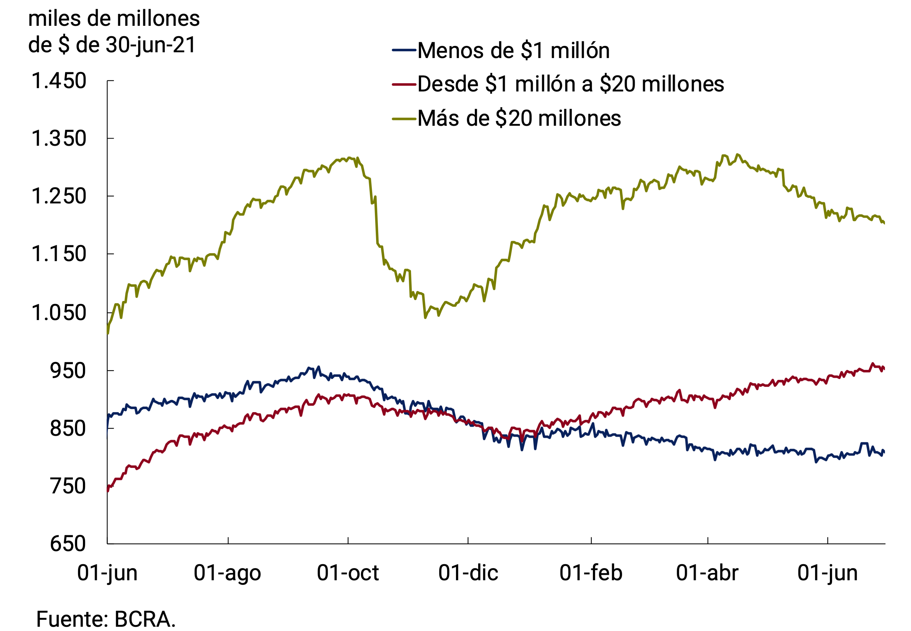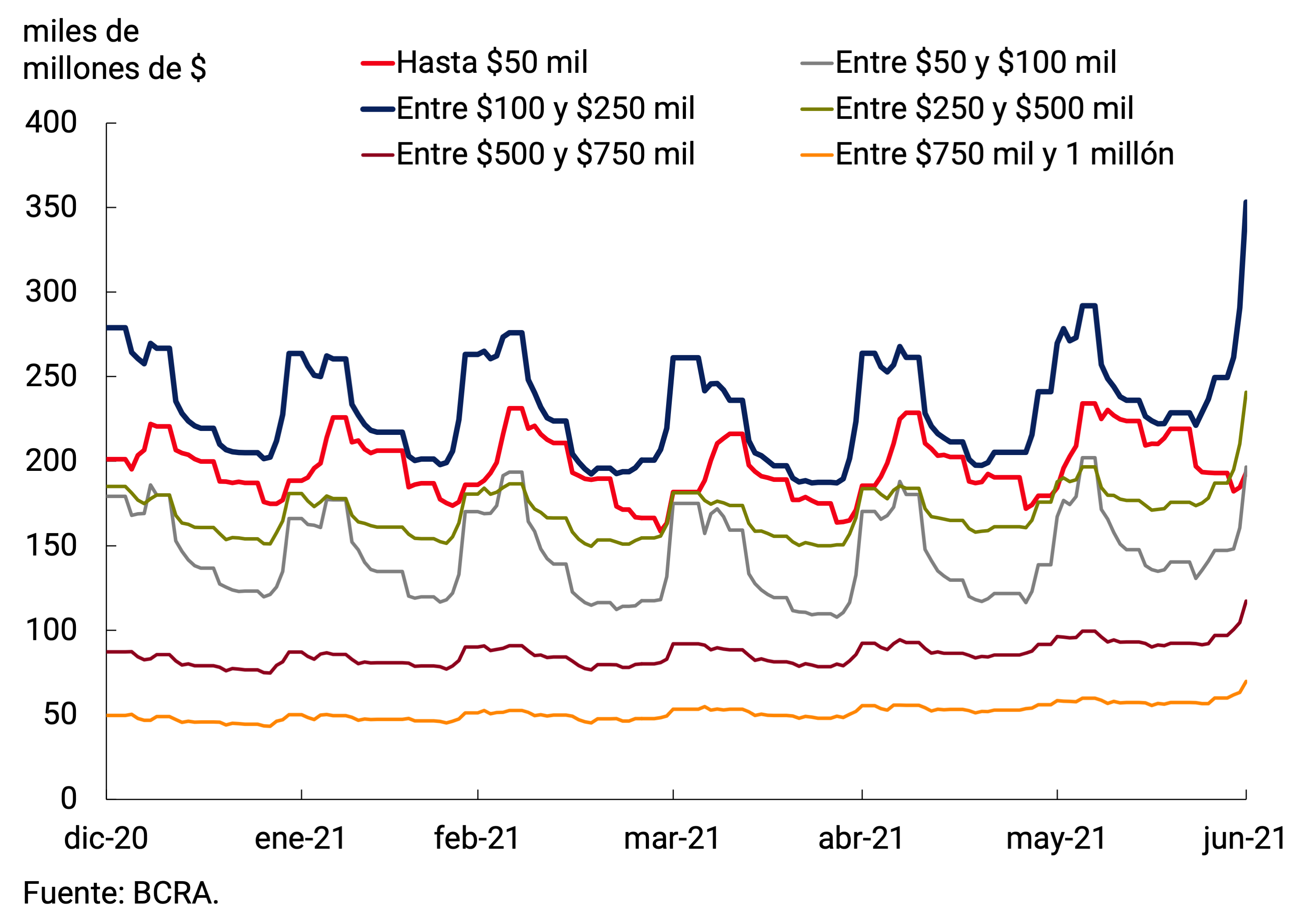 Diversos factores impactaron sobre la evolución de los depósitos a la vista no remunerados en junio. Por un lado, se transfirieron recursos adicionales a los sectores más vulnerables de la población. En particular, en dicho mes la ANSES adelantó el pago del 20% del complemento por hijo de la Asignación Universal por Hija/o (AUH) que habitualmente se efectúa en diciembre3. Esto repercutió en la dinámica de los depósitos en cajas de ahorro de personas humanas de menor estrato de monto (hasta $50 mil), que suavizaron notoriamente su caída estacional intramensual, dado que el pago se extendió entre el 8 y el 22 de junio. Por otro lado, en el sexto mes del año tuvieron lugar tramos de ajuste salarial de varios convenios colectivos, lo que se reflejó, particularmente, en el crecimiento de los depósitos en cajas de ahorro de entre $50.000 y $250.000 (ver Gráfico 2.2). Finalmente, la ley establece la obligación de integrar el pago del medio aguinaldo de junio con anterioridad al día 30 de dicho mes; sin embargo, muchas empresas y/u organismos suelen pagarlo antes de la fecha límite4. Con todo, los depósitos a la vista no remunerados registraron en el sexto mes del año un aumento mensual de 2,4% s.e. a precios constantes.