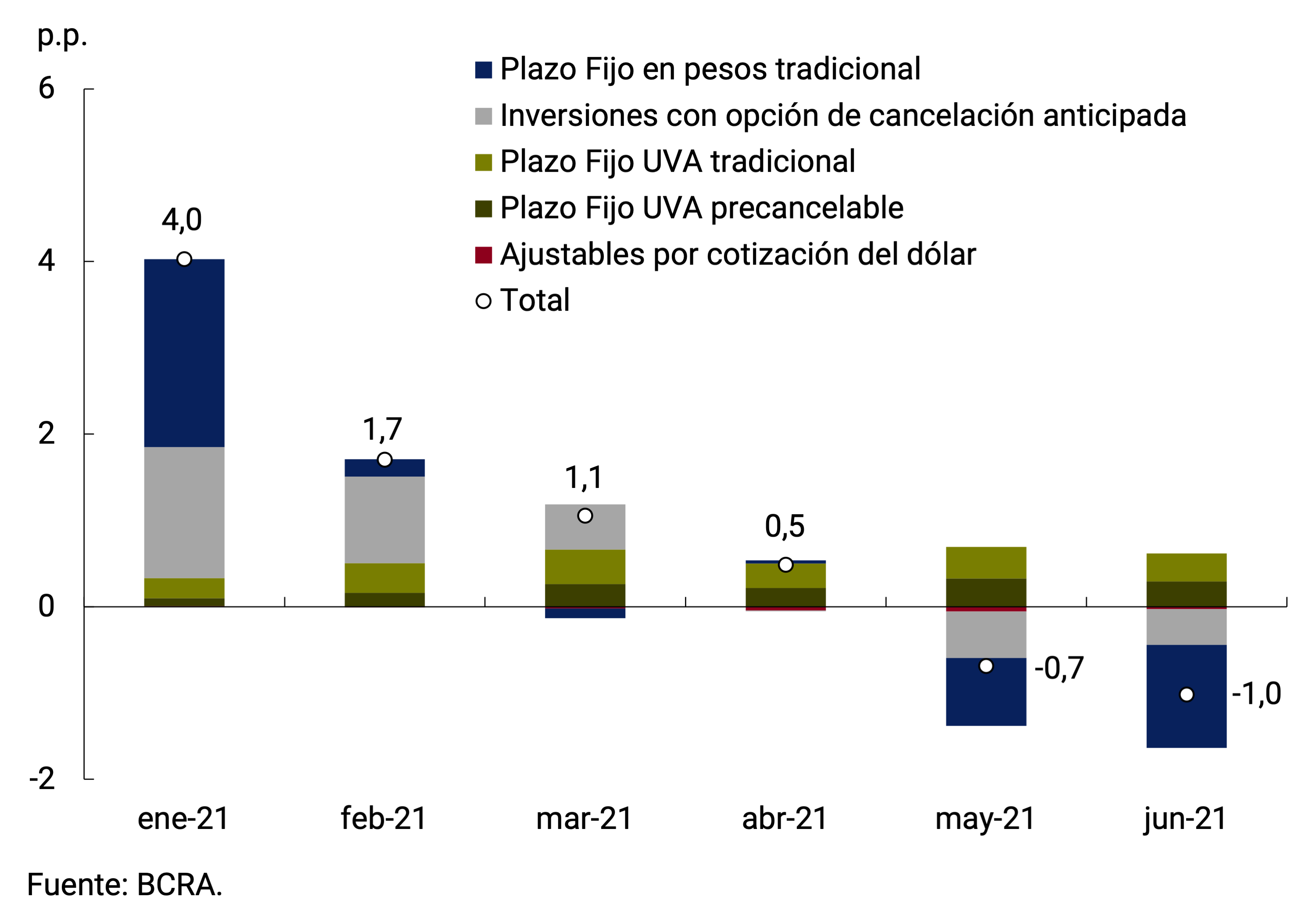 Al interior de los depósitos a plazo fijo en pesos, se observó un comportamiento heterogéneo por tipo de instrumento. Las colocaciones en pesos, tanto tradicionales como precancelables, contribuyeron negativamente a la variación mensual y fueron parcialmente compensados por el aporte positivo de los depósitos a plazo fijo denominados en UVA (ver Gráfico 3.2).