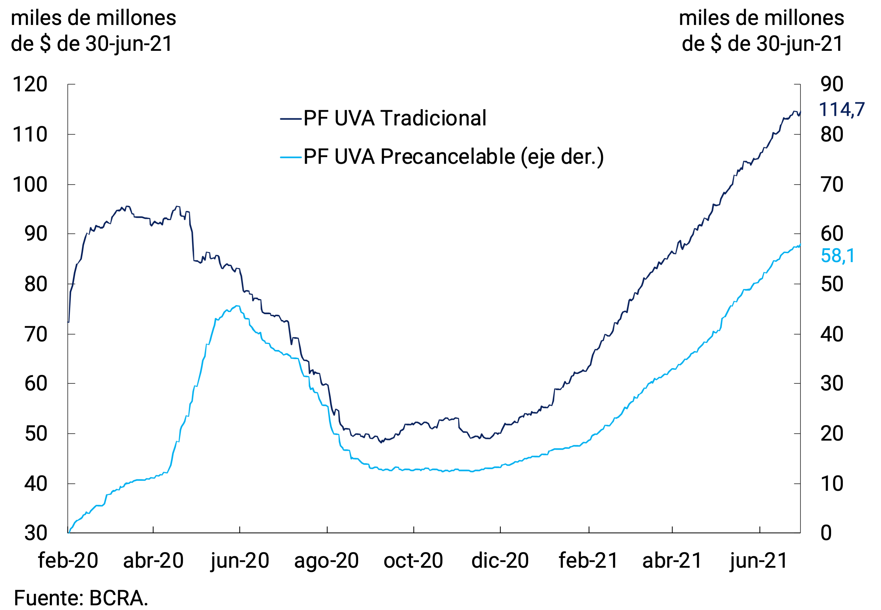 En efecto, los depósitos expresados en UVA continuaron con el dinamismo que vienen mostrando desde finales del año pasado. En junio, alcanzaron un saldo promedio mensual de $164.076 millones, lo que significó un aumento de 12,6% s.e. en términos reales respecto a mayo. El impulso provino tanto de las colocaciones en UVA tradicionales como de las que tienen opción de precancelación a partir de los 30 días de plazo, cuya tasa de expansión mensual a precios constantes fue de 9,7% y 19,0%, respectivamente (ver Gráfico 3.3). La creciente demanda de este tipo de instrumentos ajustables por CER tuvo lugar en un contexto en que el BCRA mantuvo las tasas de interés de referencia inalteradas, en línea con la necesidad de acompañar el proceso de normalización de la actividad económica. De este modo, la existencia de instrumentos con cobertura por inflación permitió canalizar el ahorro asegurando rendimientos positivos en términos reales.