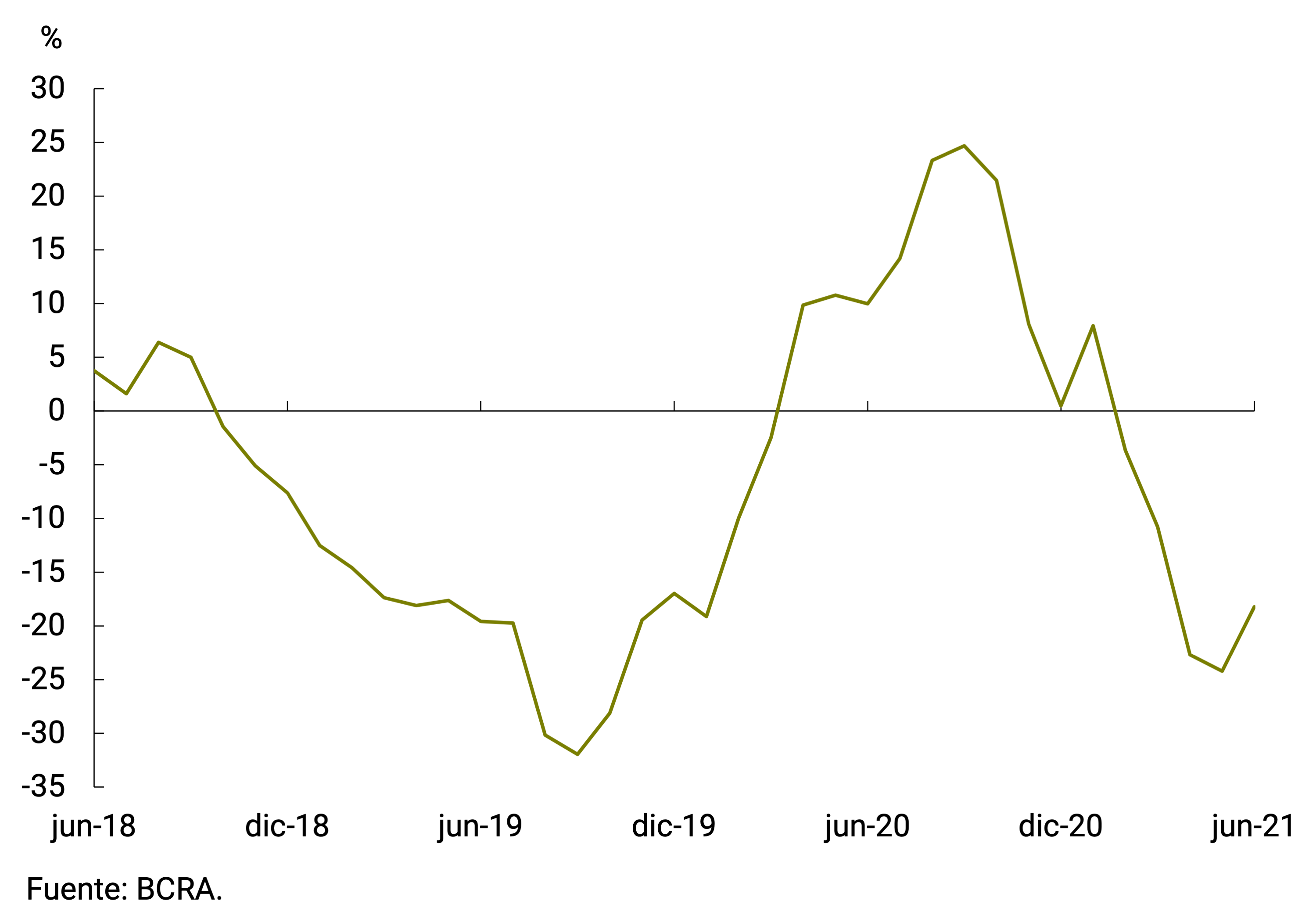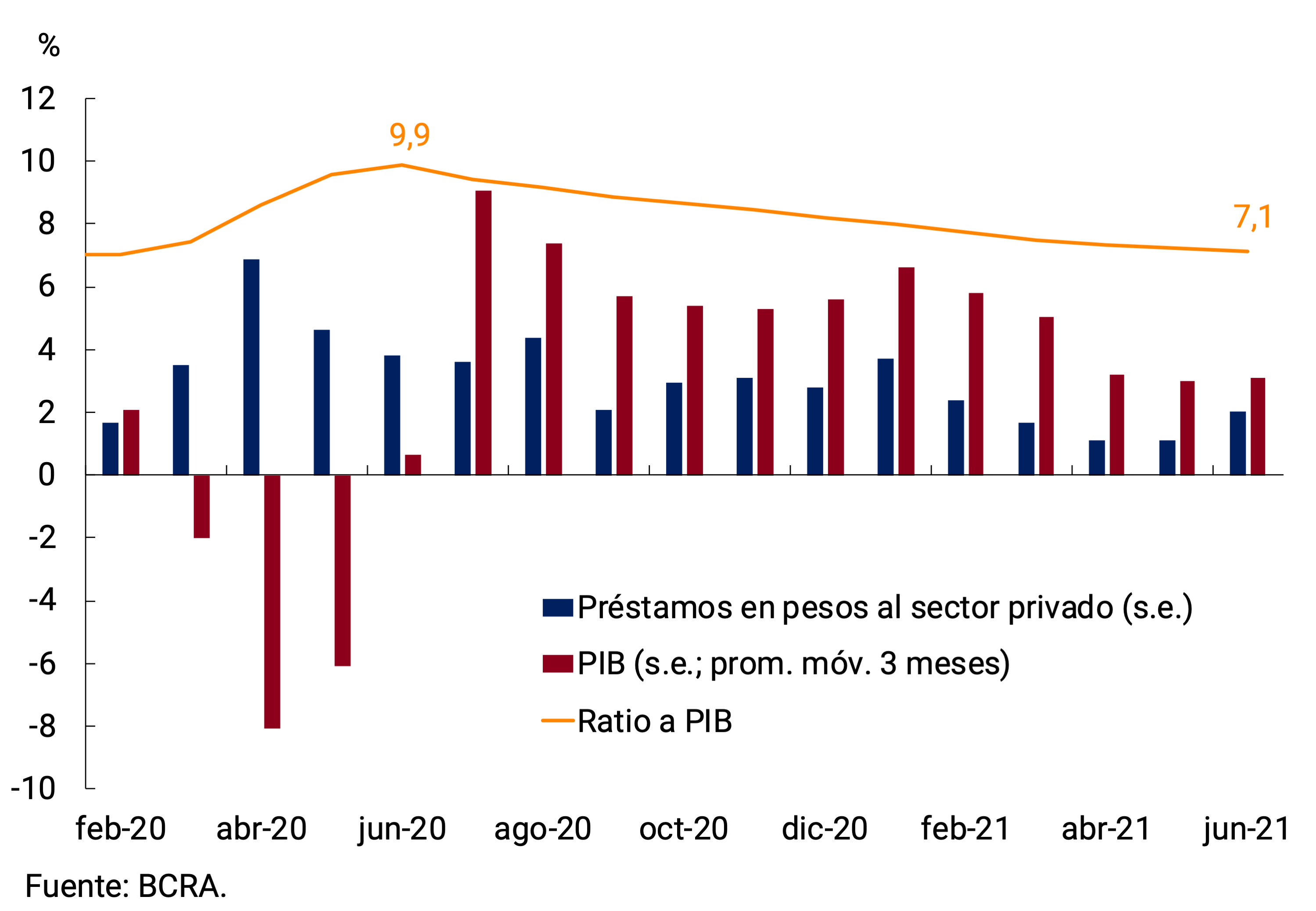 Los préstamos en pesos al sector privado, en términos reales y sin estacionalidad, habrían registrado en junio una contracción mensual de 1,1%, recortando el ritmo de caída con relación a los meses previos (ver Gráfico 5.1). En términos interanuales, acumularon una caída de 11,8% a precios constantes, influyendo una vez más en el cálculo tanto la contracción del mes como la elevada base de comparación de junio del año previo. La mayor parte de la caída mensual se explicó por el comportamiento de las financiaciones con tarjetas de crédito y aquellas instrumentadas mediante documentos, mientras que los adelantos y los préstamos prendarios fueron las únicas líneas con incidencia positiva a la variación del mes. El ratio de préstamos en pesos al sector privado a PIB se ubicó en junio en 7,1%, registro similar al observado previo al inicio de la pan-demia. La reversión en el ratio a PIB se explicó tanto por la moderación en la tasa de expansión nominal de las líneas de financiamiento como por la recuperación de la actividad económica (ver Gráfico 5.2).