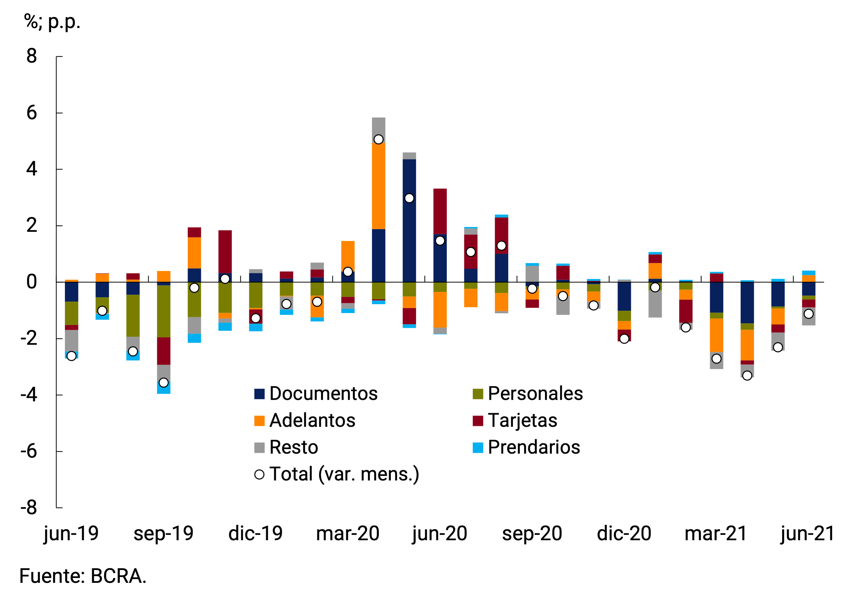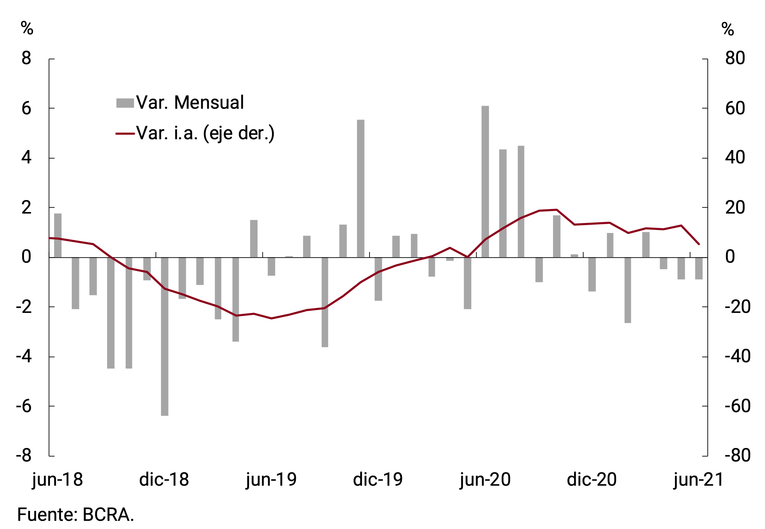 En tanto, los préstamos personales exhibieron una caída en el mes de 0,8% en términos reales y ajustados por estacionalidad. Vale señalar que la tasa de interés cobrada por los préstamos personales descendió gradualmente a partir de mediados de mes y con mayor fuerza en los últimos días. Esto último estuvo vinculado a una línea especial de crédito creada por una entidad bancaria. Con todo, la tasa promedio de junio se ubicó en 52,7% n.a., lo que implicó una reducción de 1,9 p.p. respecto de mayo.