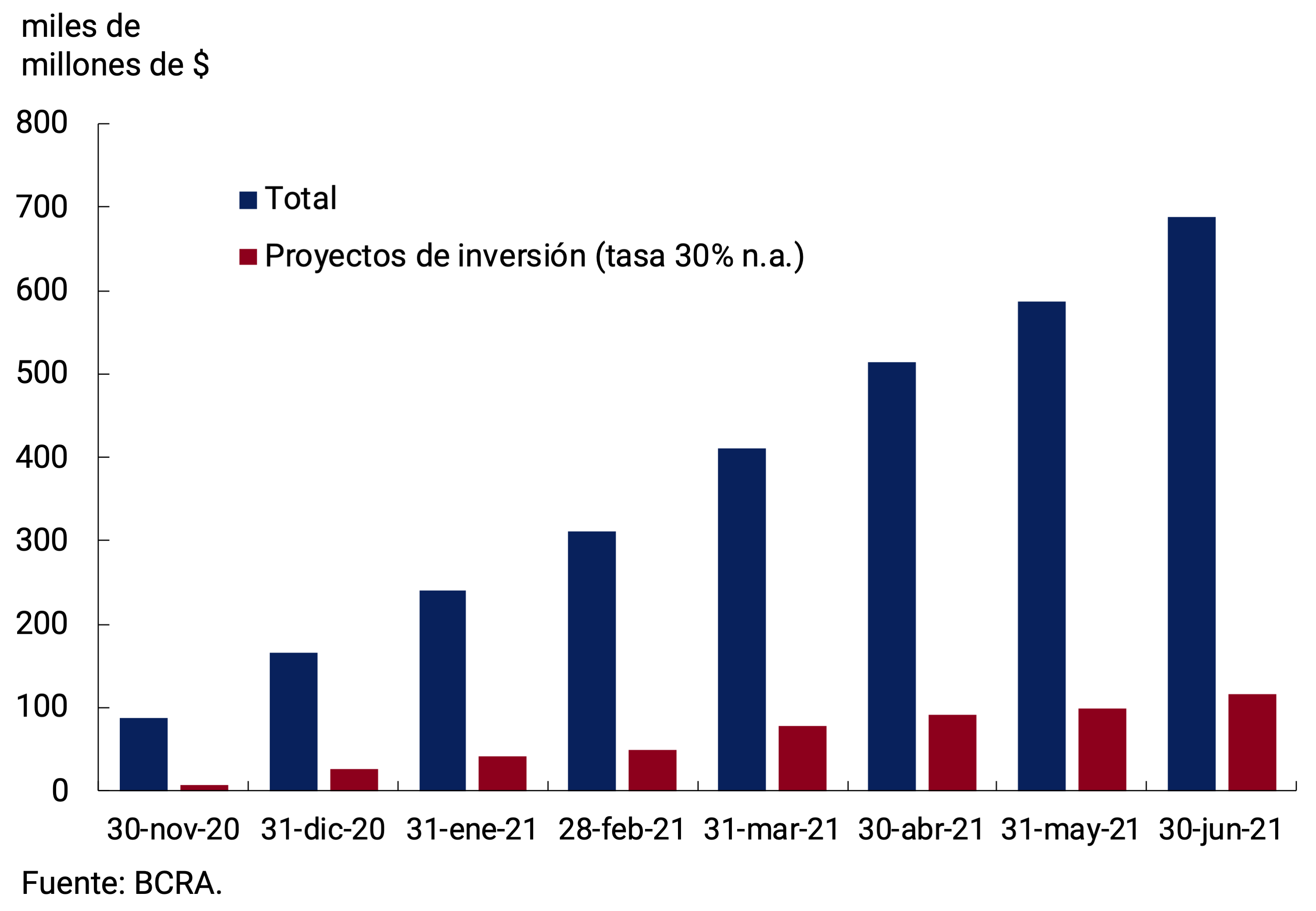 En junio, en el marco de la LFIP, se otorgaron préstamos por $100.375 millones y la línea acumula desembolsos por aproximadamente un total de $687.400 millones. En cuanto a los destinos de estos fondos, alrededor del 83% del total desembolsado corresponde a la financiación de capital de trabajo y el resto a la línea que financia proyectos de inversión (ver Gráfico 5.4). Por último, vale señalar que al momento de esta publicación el número de empresas que accedió a la LFIP ascendió a alrededor de 147.000.
