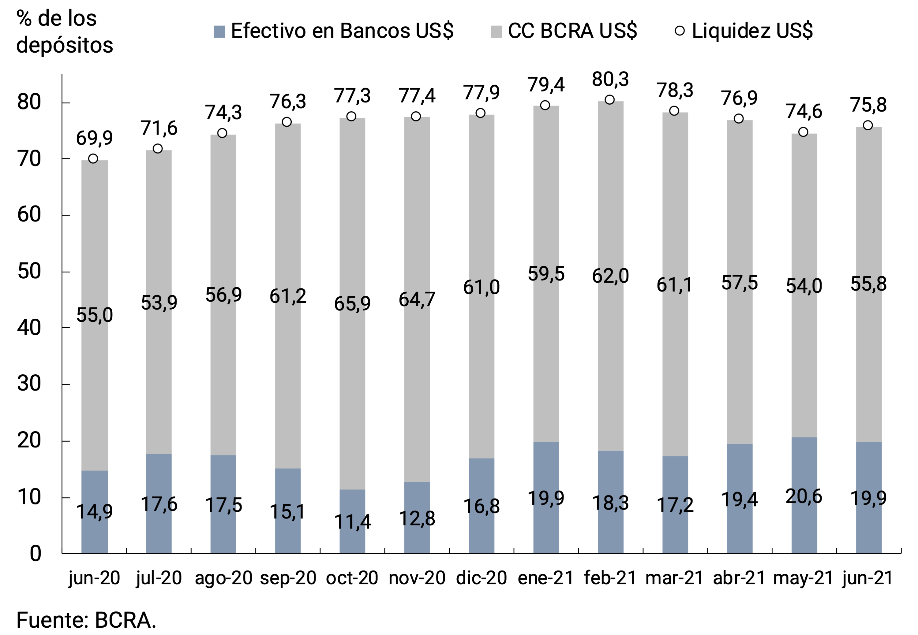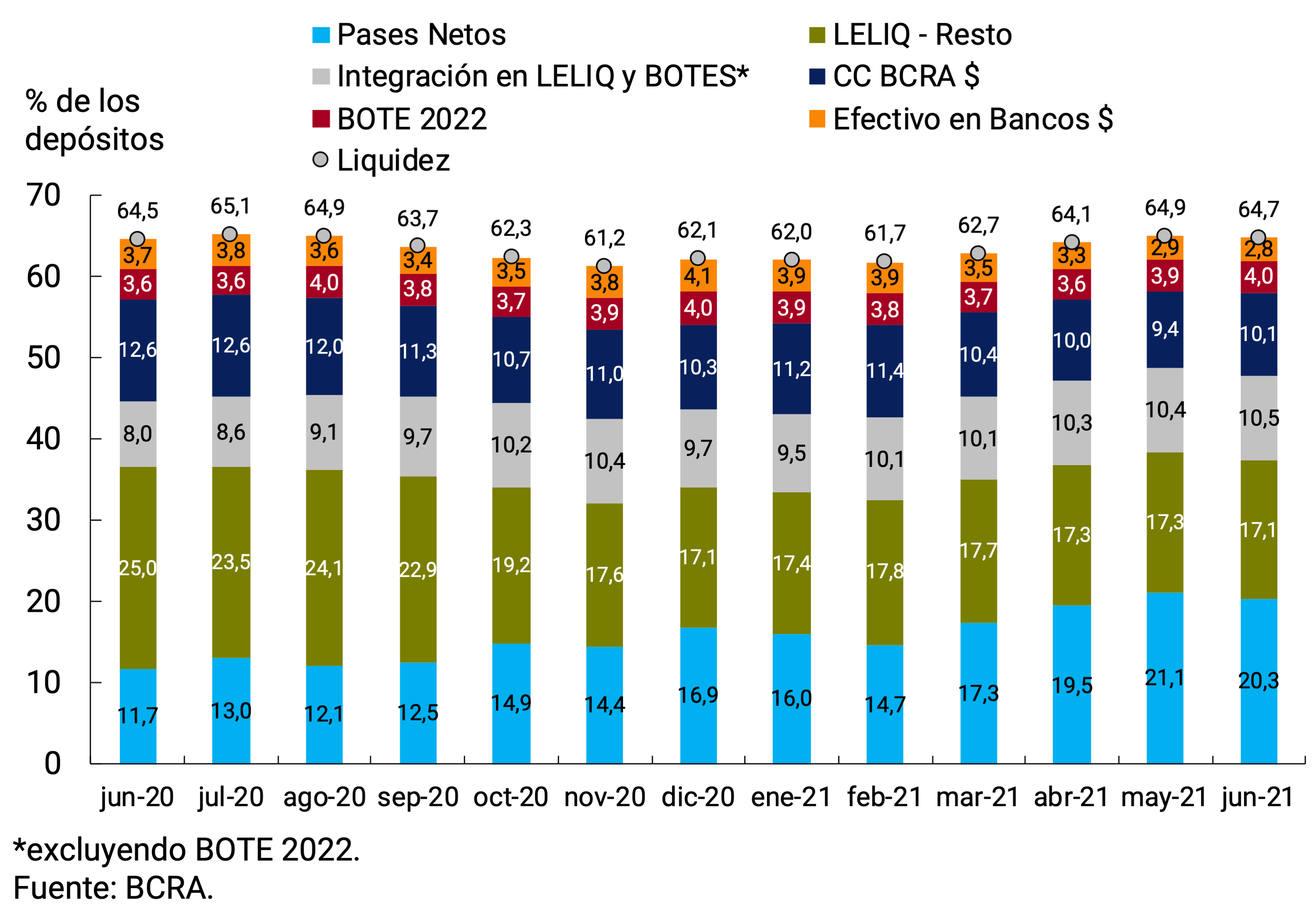 10 Incluye las cuentas corrientes en el BCRA, el efectivo en bancos, los saldos de pases concertados con el BCRA, las tenencias de LELIQ y los bonos elegibles para integrar encajes.