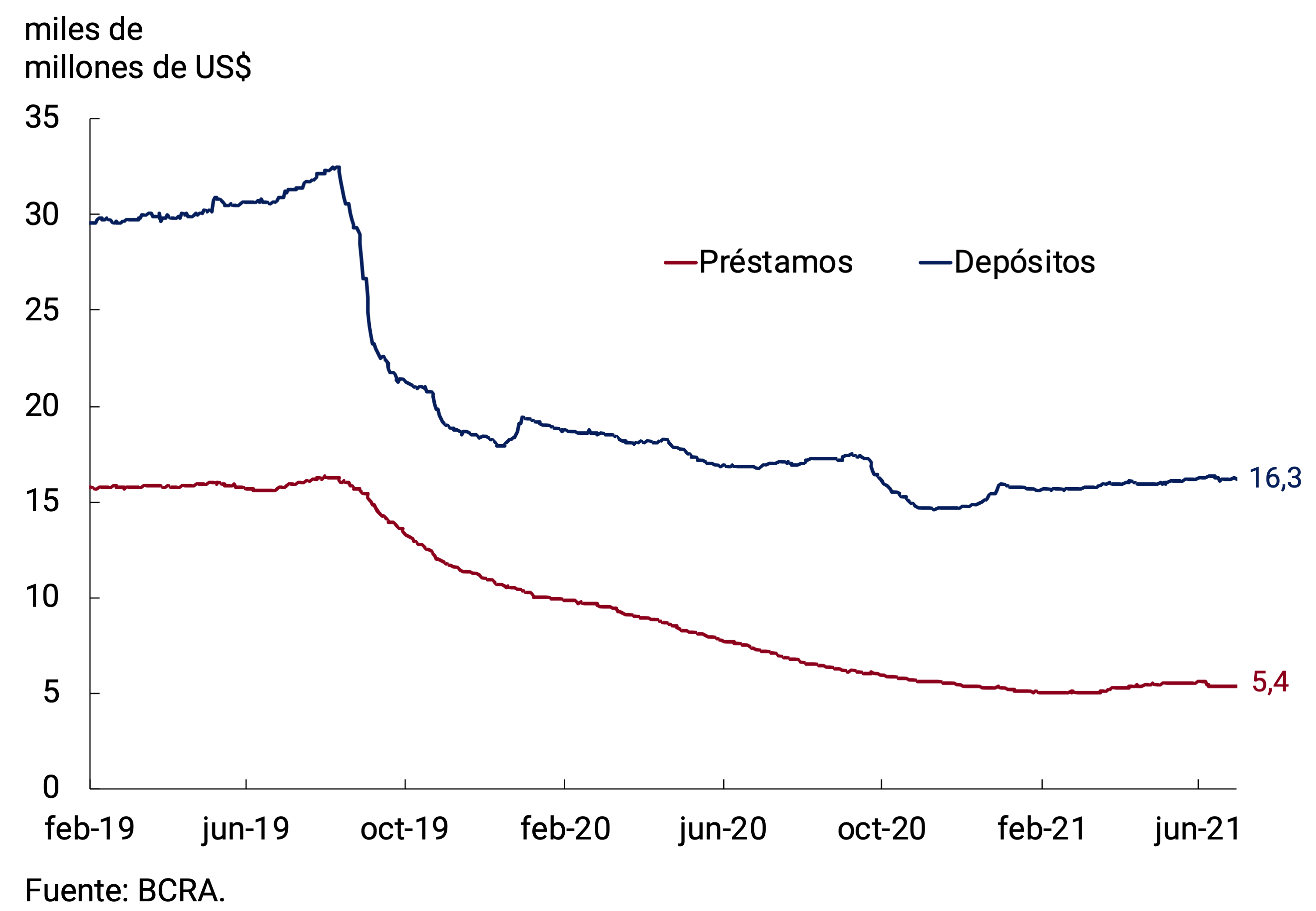 Los depósitos y préstamos en moneda extranjera al sector privado presentaron variaciones poco significativas en el mes. El saldo promedio mensual de los primeros se ubicó en US$16.242 millones (+US$158 millones respecto a mayo), mientras que los préstamos promediaron en junio US$5.416 millones, registrando una disminución en el mes (-US$124 millones; ver Gráfico 7.1).