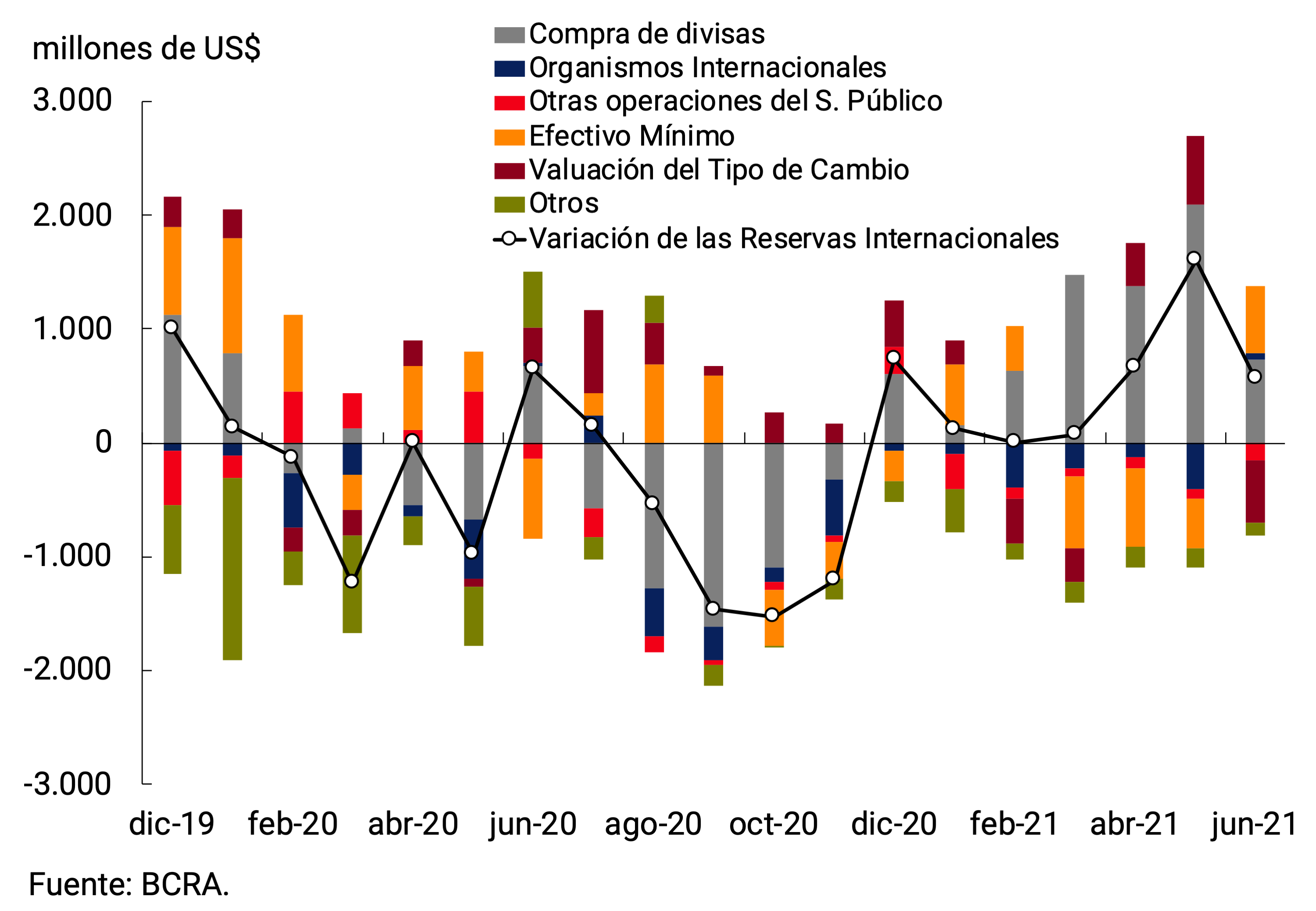 Las Reservas Internacionales del BCRA registraron una expansión de US$565 millones respecto al 31 de mayo, finalizando el mes con un saldo de US$42.437 millones, acumulando 7 meses consecutivos de subas. En cuanto a los factores de variación, la compra neta de divisas y el incremento en la posición de efectivo mínimo de las entidades financieras explicaron la expansión del mes, aunque estos factores fueron parcialmente compensados por los cambios de valuación del tipo de cambio y, en menor medida, por los pagos netos del sector público (ver Gráfico 7.3).