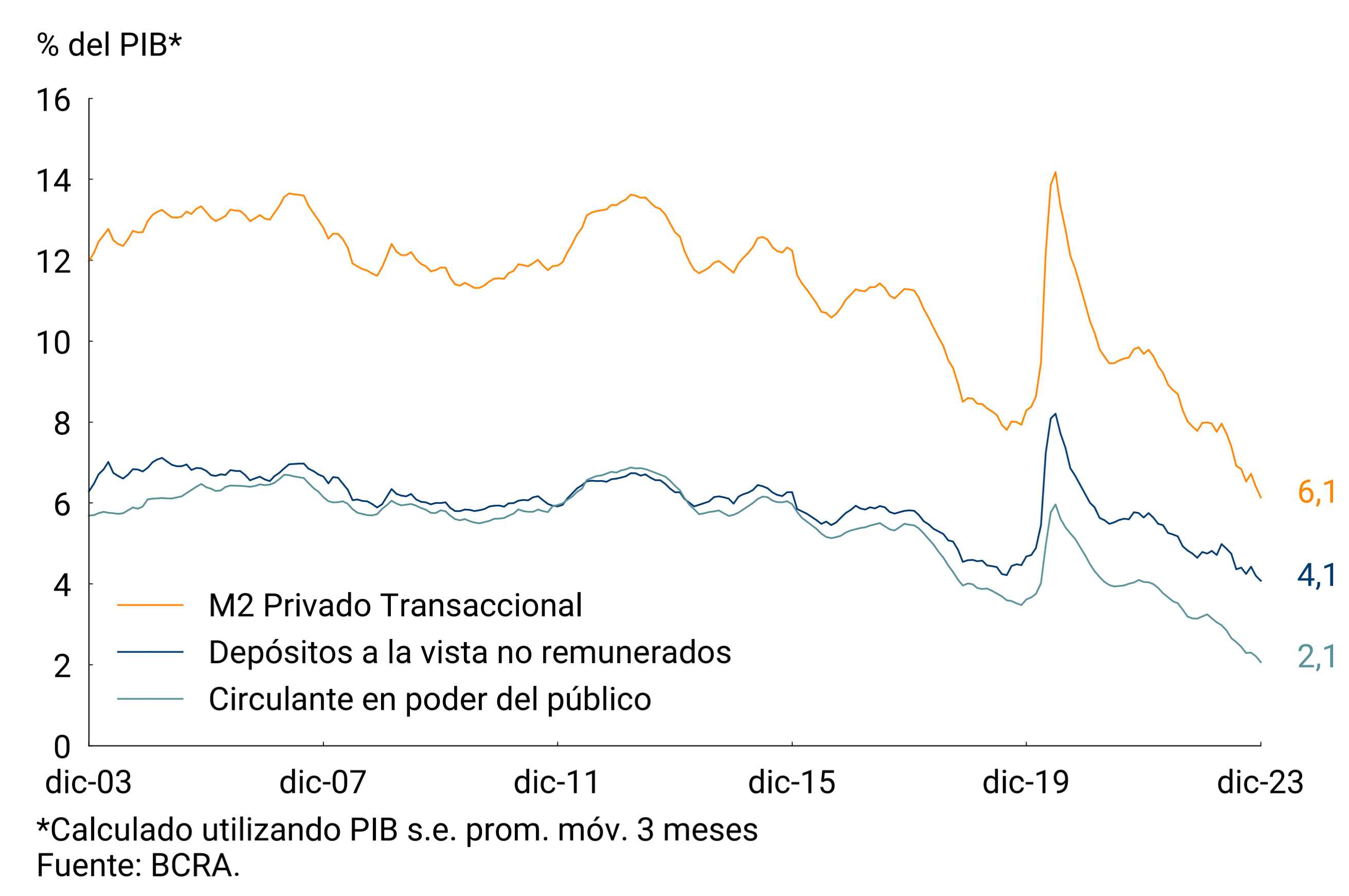1 Corresponde al M2 privado excluyendo depósitos a la vista remunerados de empresas y prestadoras de servicios financieros. Se excluyó este componente dado que se asemeja más a un instrumento de ahorro que a un medio de pago.