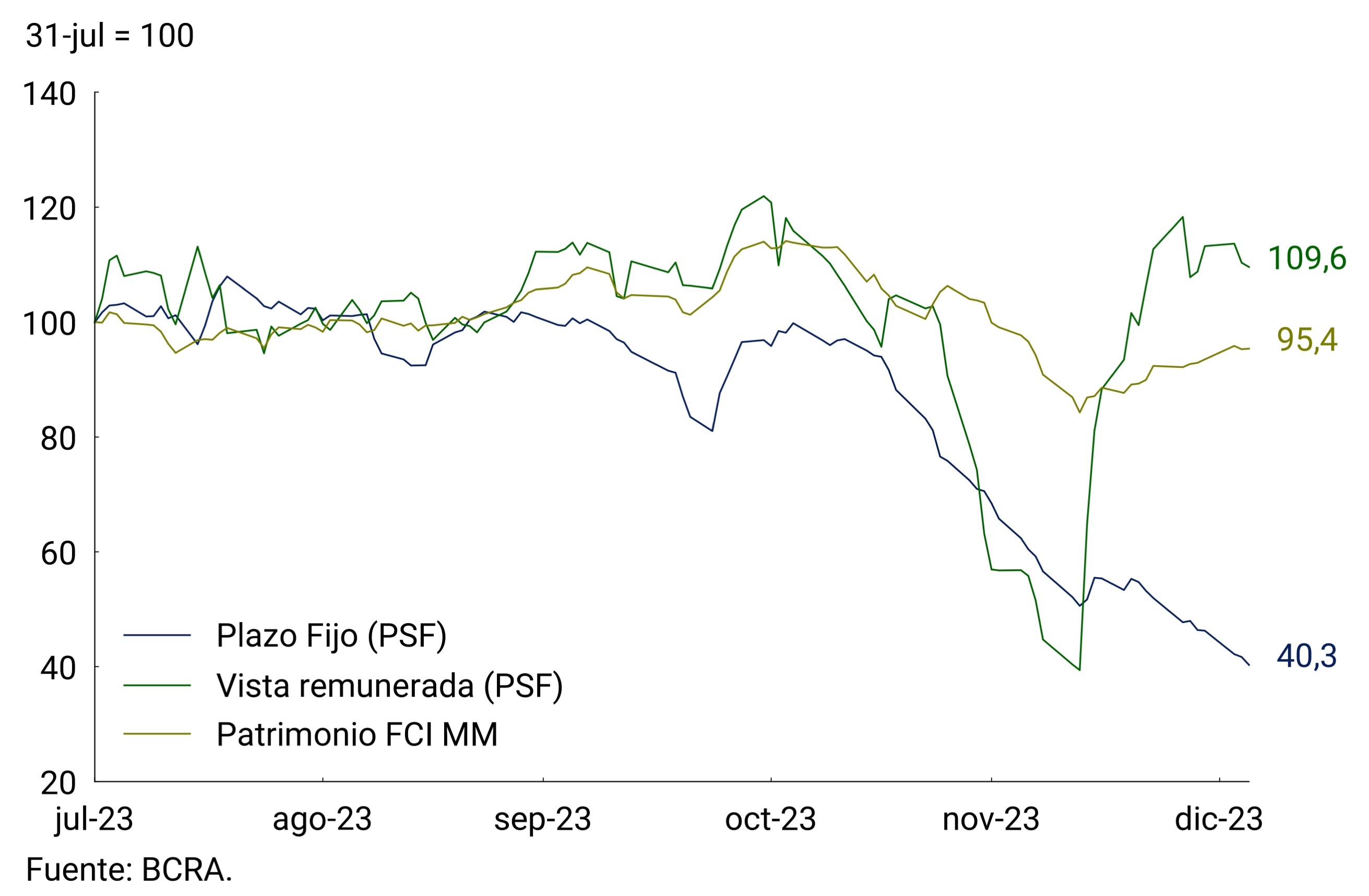 En cuanto a los cambios normativos, cabe mencionar que se incrementó hasta 760 días el plazo máximo de los títulos públicos nacionales en pesos adquiridos por suscripción primaria admitidos para integración de efectivo mínimo a partir del 20 de diciembre7. Por otra parte, se dispuso que aquellos títulos susceptibles de ser vendidos al BCRA por el mecanismo de contratos de opciones de venta (put option) y que sean licitados a partir del 18 de diciembre de 2023 no computarán a efectos del límite de fraccionamiento crediticio al sector público8.