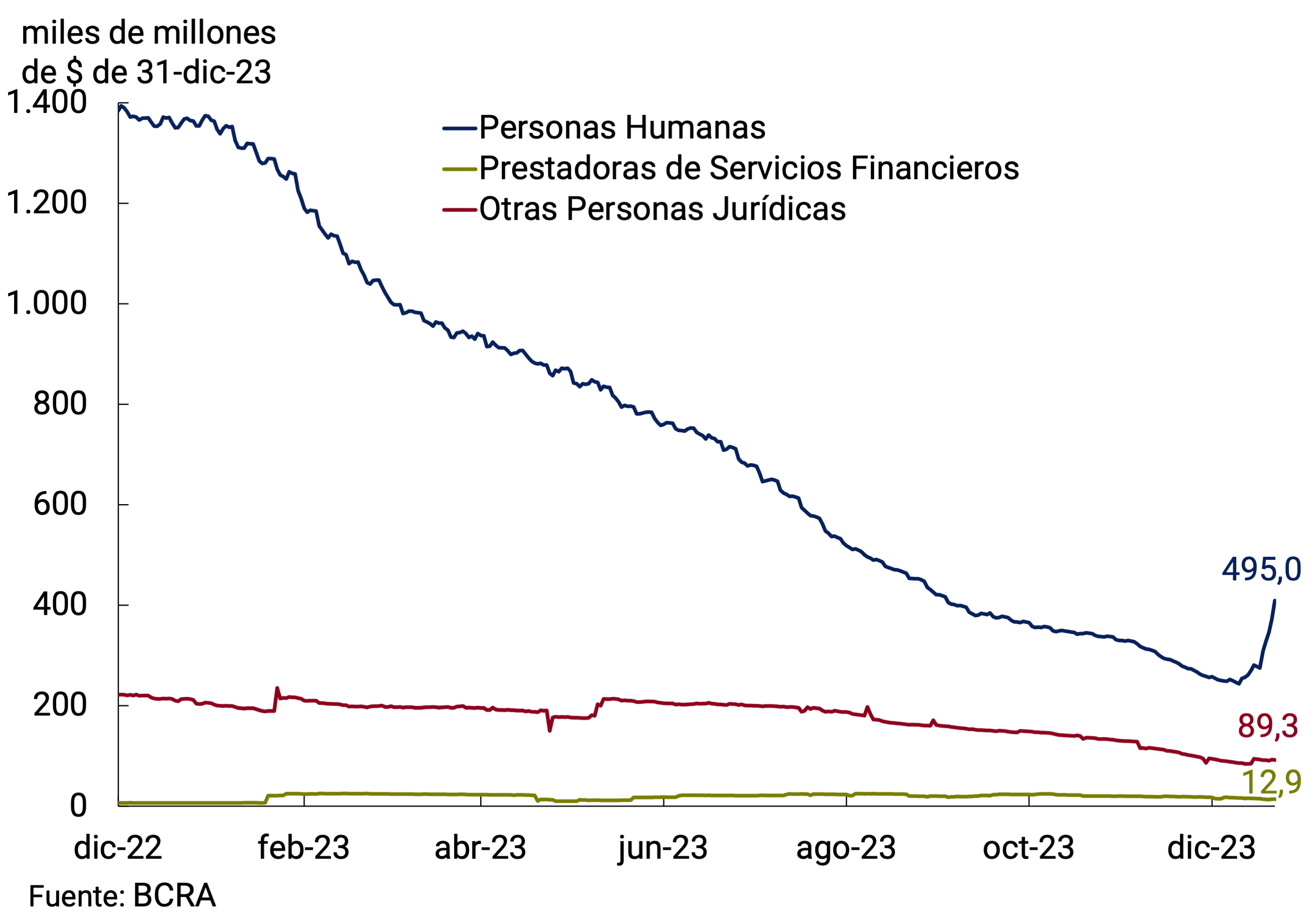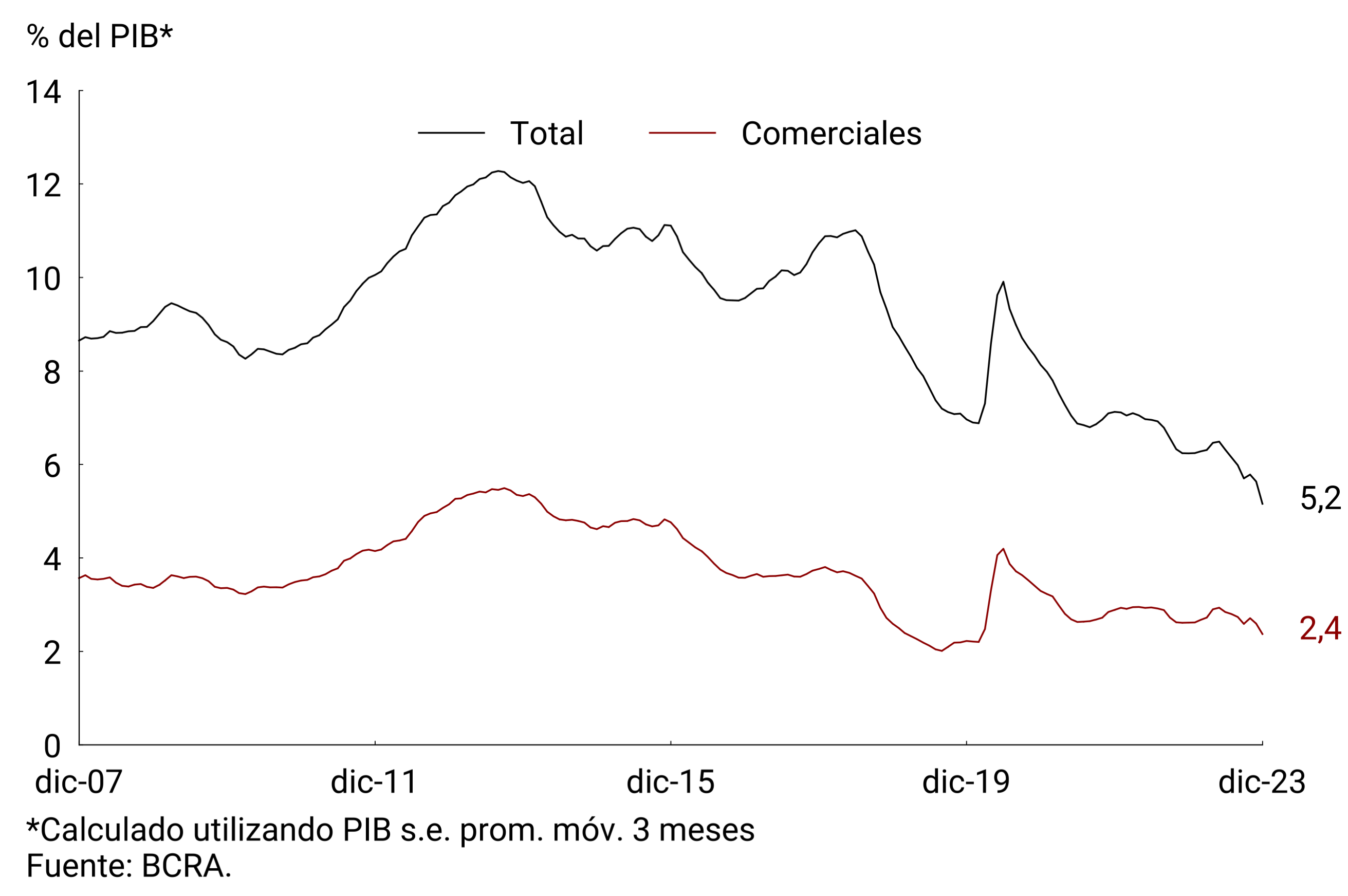 Los depósitos a plazo fijo en pesos del sector privado, al igual que los medios de pago, exhibieron en los últimos meses una sistemática caída por efecto la aceleración inflacionaria, que ganó dinamismo en diciembre por el sinceramiento del tipo de cambio y otros precios que estaban reprimidos. Las colocaciones a plazo fijo habrían experimentado una contracción mensual de 23,6% s.e. a precios constantes en diciembre y, de esta manera, acumularían una caída del orden del 48,2% en 2023. De este modo, el saldo de estas colocaciones a precios constantes se redujo hasta registros mínimos de los últimos 20 años. Como porcentaje del PIB se habrían ubicado en 4,7% en diciembre, lo que implicaría una disminución de 0,8 p.p. respecto al mes previo.