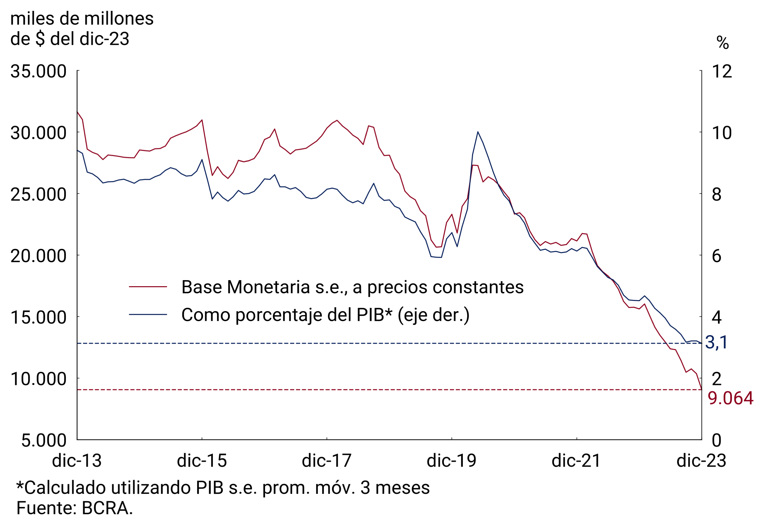 En diciembre, el saldo promedio de la Base Monetaria fue de $9,2 billones, lo que implicó una expansión mensual de 18,1% ($1.412 mil millones) a precios corrientes. Cabe señalar que la Base Monetaria presenta una estacionalidad positiva en diciembre, por lo que si la corregimos por este efecto y medida a precios constantes habría exhibido una contracción de 12,5% en el mes y, en el año, habría acumulado una caída del 42%. Como ratio del PIB, la Base Monetaria se ubicaría en 3,1%, disminuyéndose levemente respecto al registro de noviembre, y se mantiene entre los registros más bajos de los últimos 20 años (ver Gráfico 4.1).