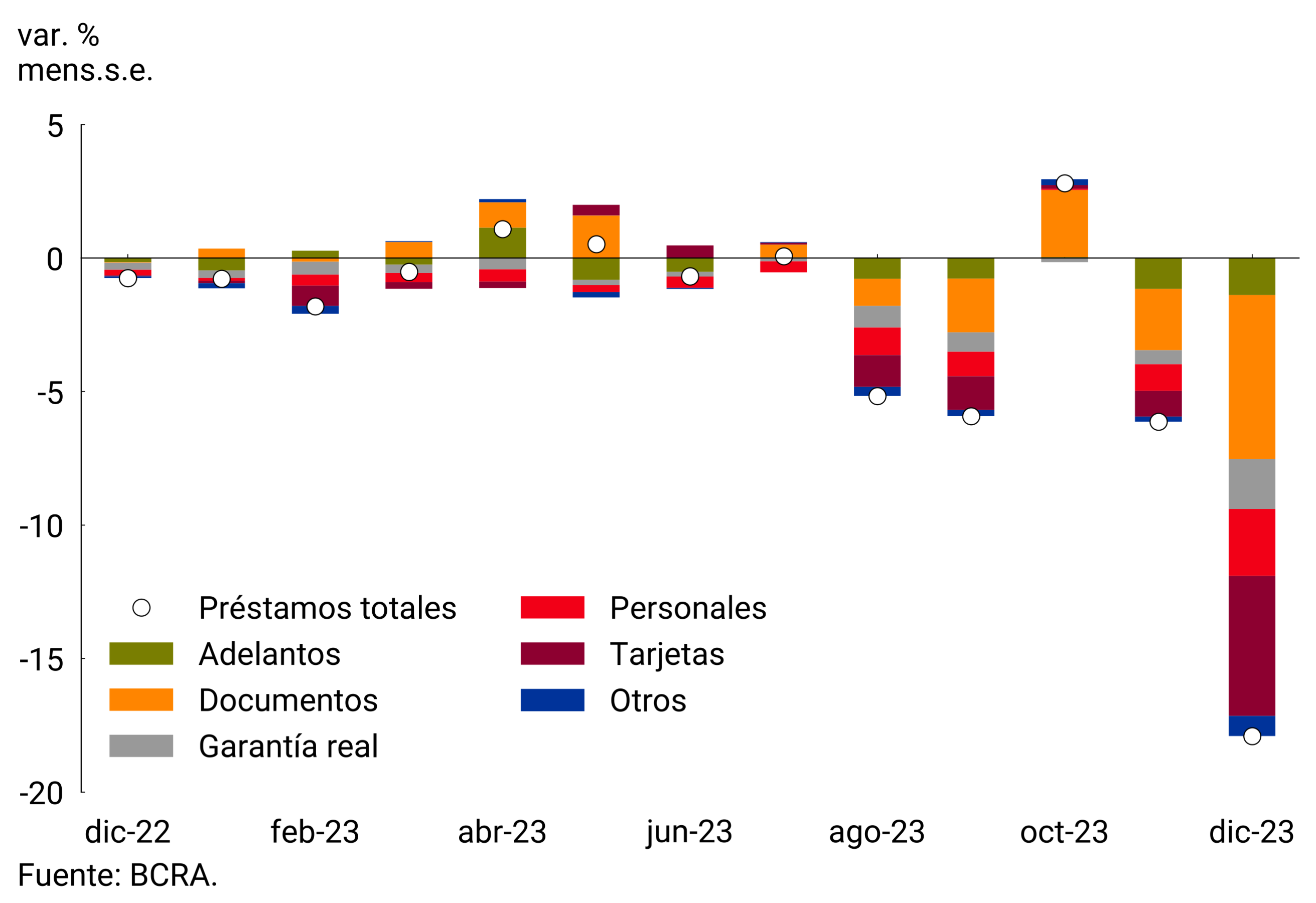 Las líneas comerciales habrían mostrado una fuerte disminución, con una caída mensual de -17,7% s.e. en términos reales y se ubicarían -24,1% por debajo del nivel de diciembre de 2022. Por instrumentos, los préstamos otorgados mediante documentos se habrían contraído en diciembre 19,6% s.e. y se encontrarían 16,4% por debajo de su nivel de un año atrás. Al interior de estas líneas, los documentos a sola firma, de mayor plazo promedio, habrían registrado una disminución de 18,5% s.e. En tanto, los documentos descontados habrían caído 20,5% s.e. en el mes. Por su parte, los adelantos se habrían contraído 13,8% s.e. mensual y 36,8% i.a.