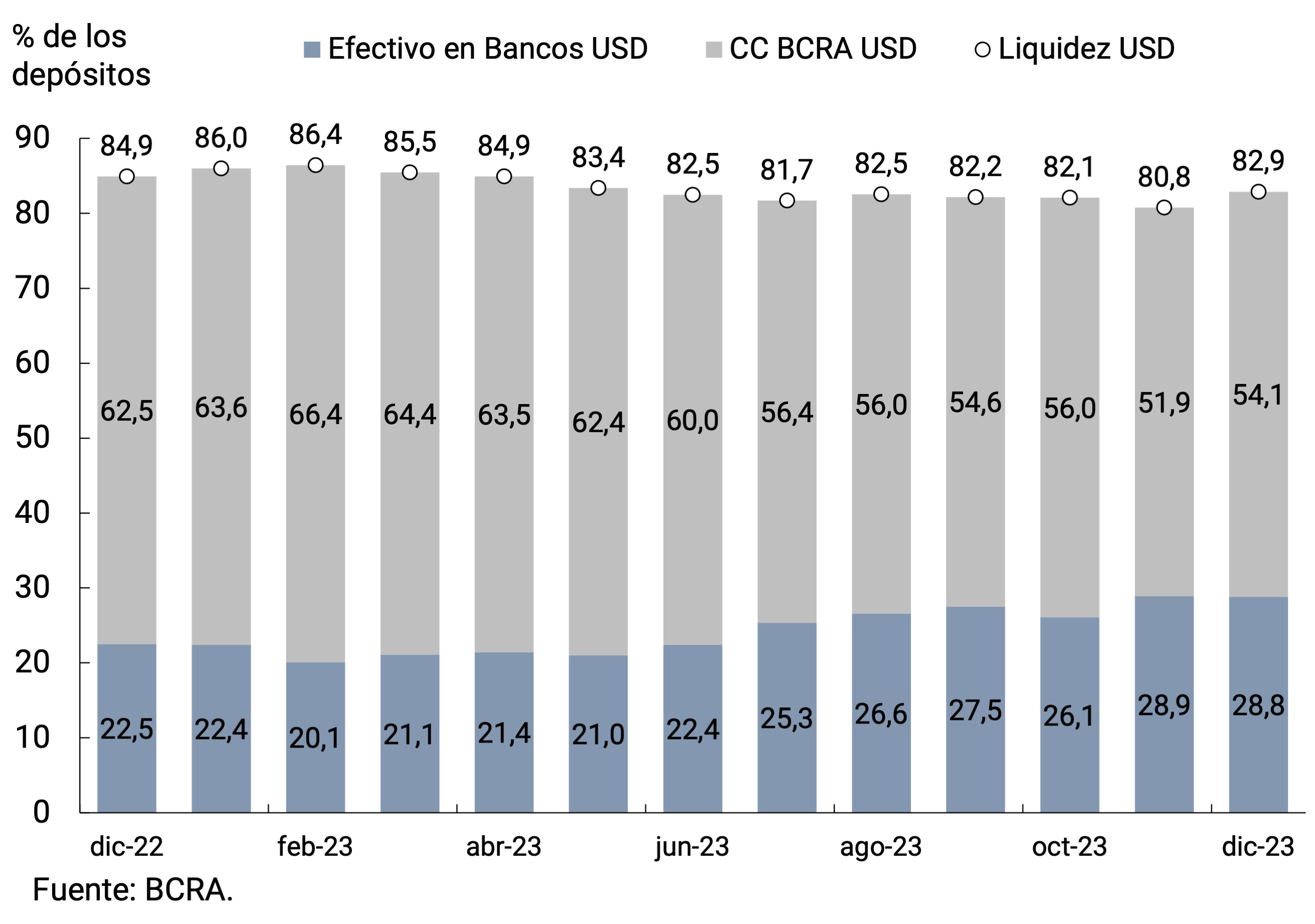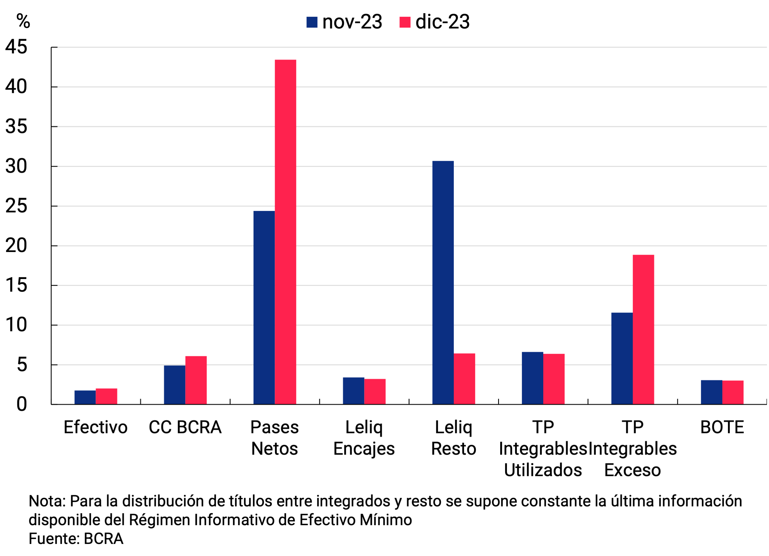 6 Incluye las cuentas corrientes en el BCRA, el efectivo en bancos, los saldos de pases netos concertados con el BCRA, las tenencias de LELIQ y NOTALIQ y los bonos públicos elegibles para integrar encajes.