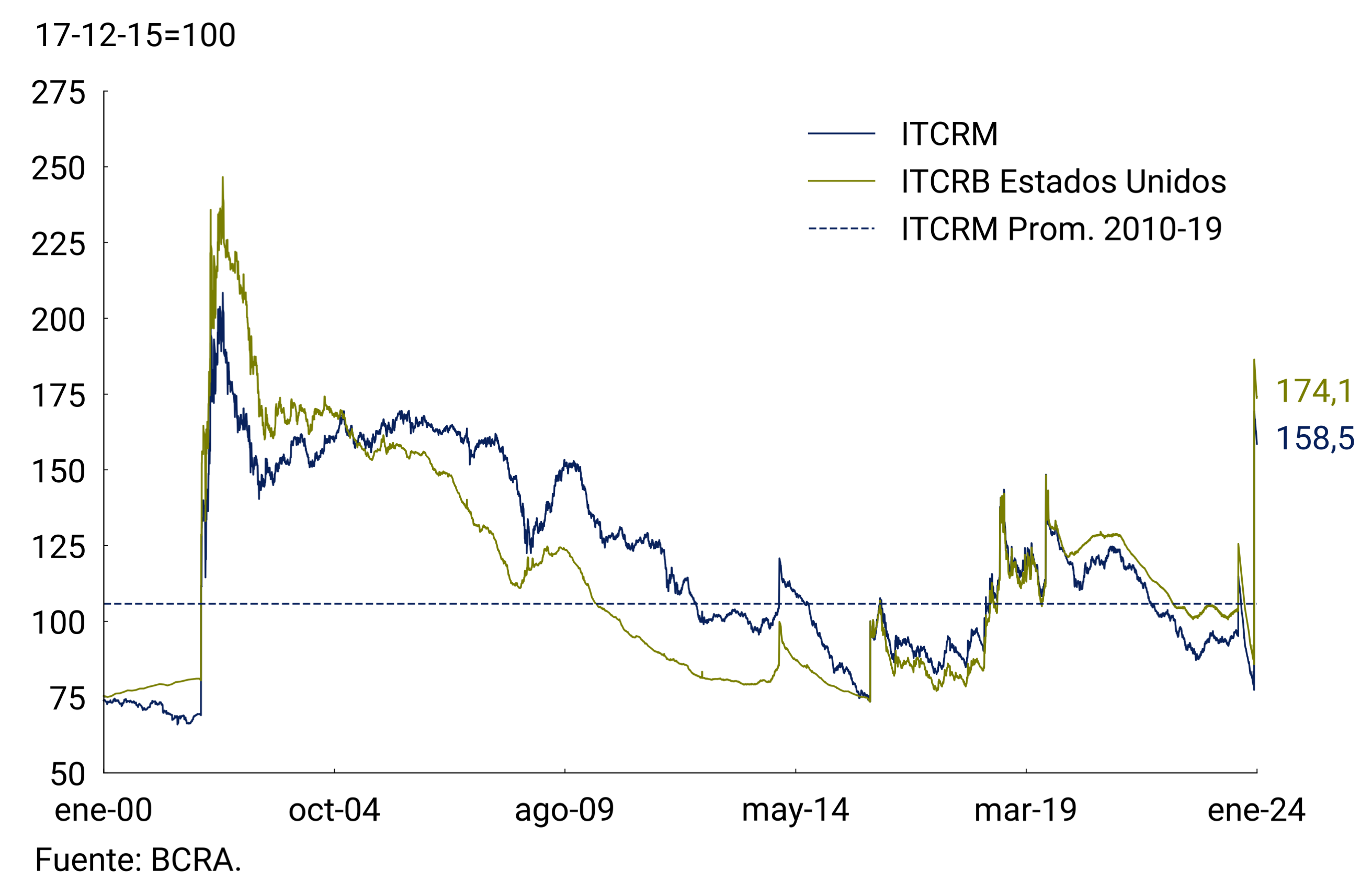 En el marco de la transición hacia un régimen que asegure la estabilidad macroeconómica, la nueva administración decidió corregir el tipo de cambio nominal (TCN) bilateral respecto del dólar estadounidense, llevándolo a $800/USD. Además, se estableció un sendero de deslizamiento de 2% mensual. El ajuste del tipo de cambio cumplirá el rol de un ancla complementaria para las expectativas de inflación, hasta tanto el compromiso y la visibilidad del esfuerzo fiscal sean apreciados en su total dimensión. De esta manera, el Índice de Tipo de Cambio Real Multilateral (ITCRM) alcanzó niveles similares a los registrados entre 2004 y 2007 (ver Gráfico 7.3).