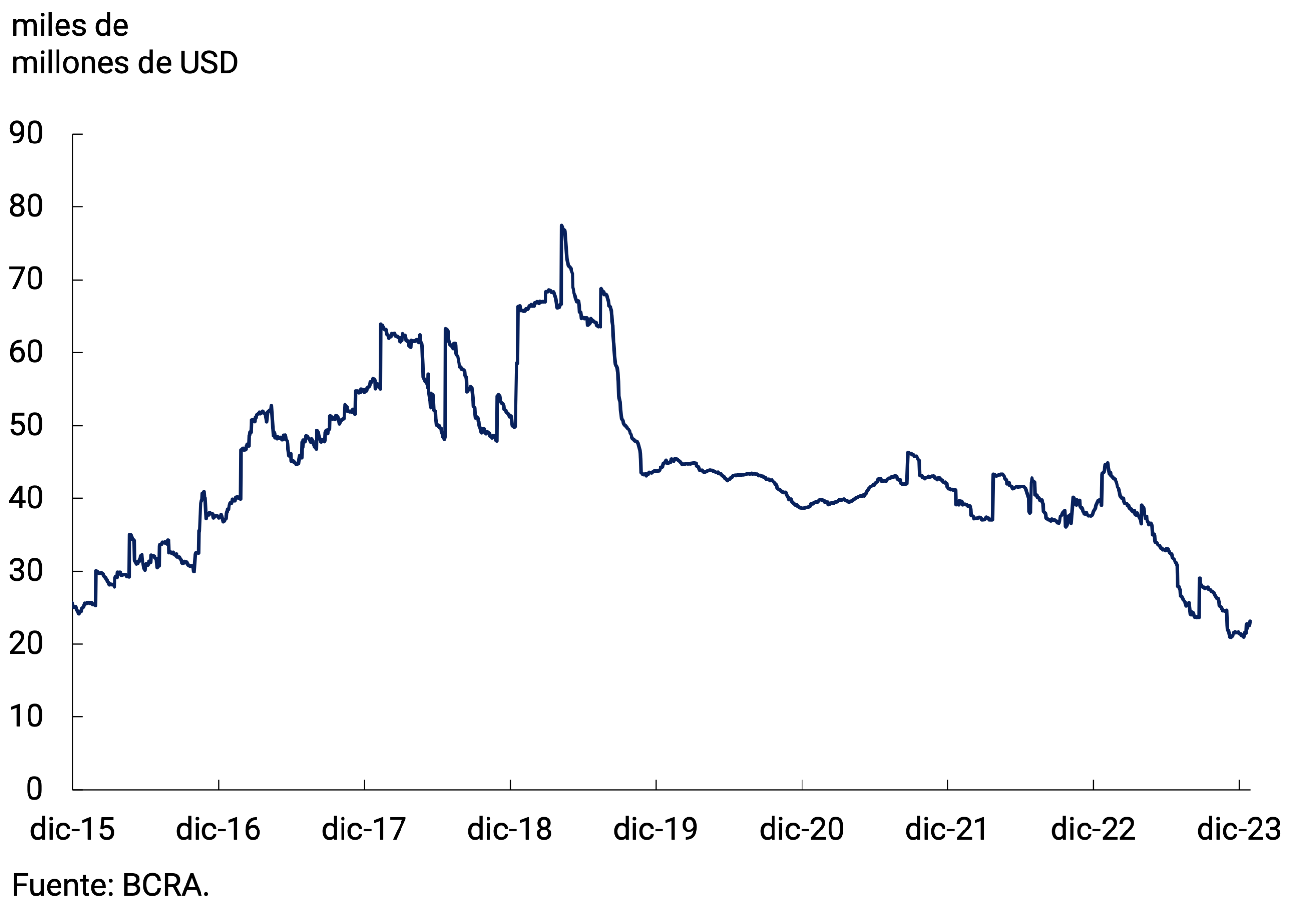 Las Reservas Internacionales del BCRA finalizaron diciembre con un saldo de USD23.073 millones, registrando una suba de USD1.560 millones respecto a fines de noviembre (ver Gráfico 7.4). Sobre esta dinámica incidió la corrección cambiaria y la reducción en la brecha respecto de los tipos de cambios financieros, lo que le permitió al BCRA realizar compras netas de divisas por casi USD2.900 millones en las últimas 12 jornadas del año. Por último, cabe destacar que el 21 de diciembre se realizó un pago al FMI por USD919 millones, que se afrontó con un préstamo de la CAF.