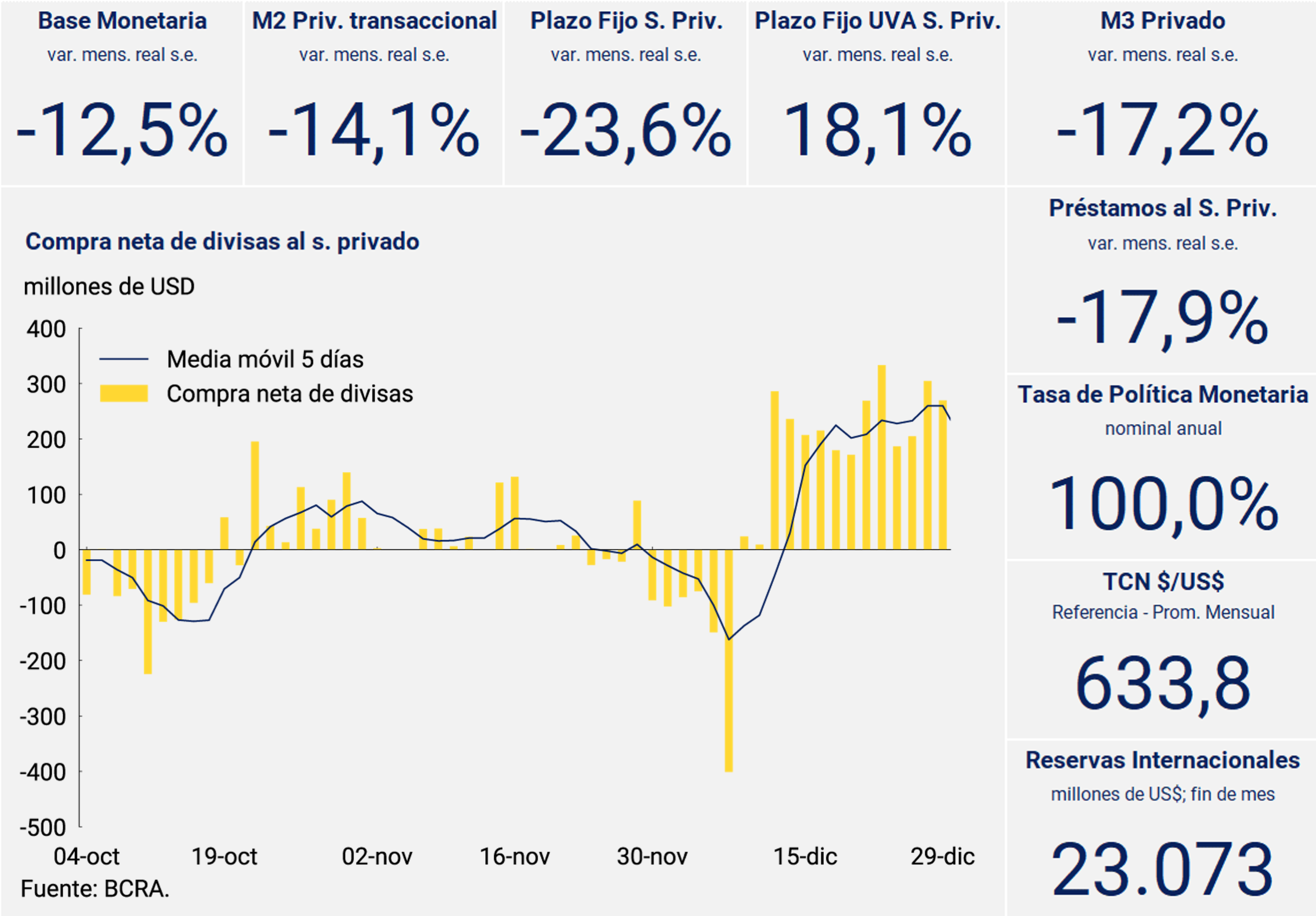 En el frente externo se anunció el establecimiento de un nuevo tipo de cambio de $800/USD en el Mercado Libre de Cambios (MLC). Temporariamente, y hasta tanto el compromiso y la visibilidad del esfuerzo fiscal sean apreciados en su total dimensión, el ajuste del tipo de cambio cumplirá el rol de ancla complementaria en las expectativas de inflación. Asimismo, se definieron nuevas condiciones para el acceso al MLC para el pago de importaciones, al tiempo que se simplificó el sistema de pagos de estas. Con el objetivo de dar previsibilidad a los pagos asociados con el stock de deuda comercial se comenzaron a licitar los nuevos Bonos para la Reconstrucción de una Argentina Libre (BOPREAL). En este marco, entre el 13 de diciembre y el cierre del mes, la compraventa de divisas netas del BCRA con el sector privado dejó un saldo positivo de USD2.863 millones.