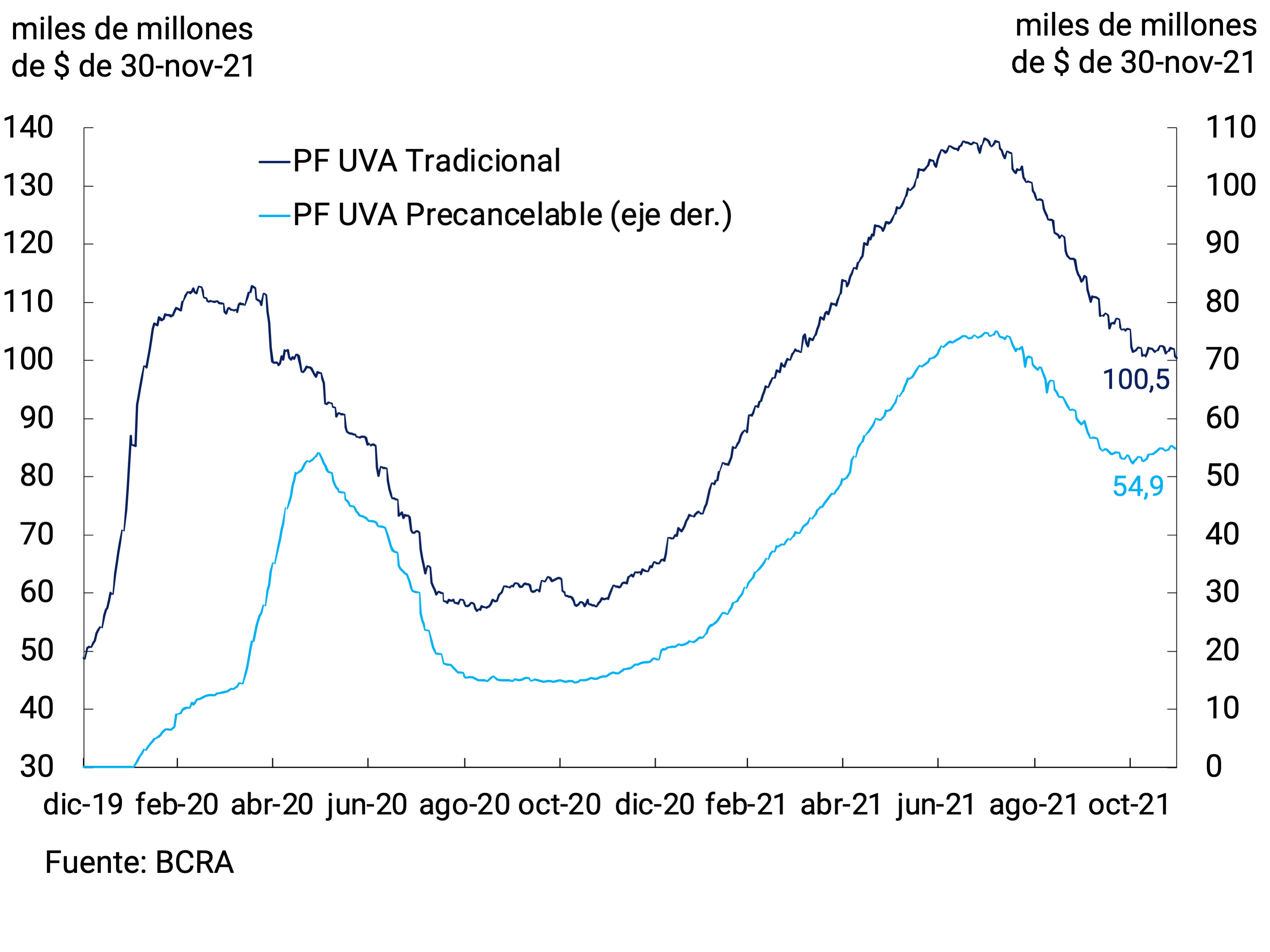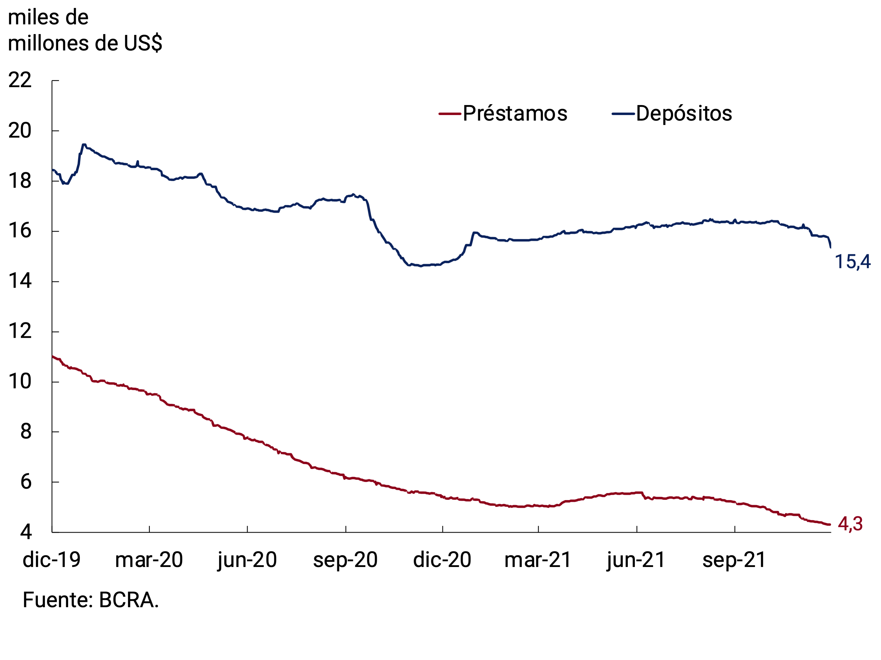 En lo que se refiere a modificaciones regulatorias, a principios de mes, se dispuso que las entidades financieras mantuvieran hasta fin de noviembre una posición global neta en moneda extranjera que no supere al mínimo entre la posición de contado del 4 de noviembre y el promedio mensual de saldos diarios registrado en octubre del 2021, sin considerar los títulos valores emitidos por residentes que se hubiesen allí imputado7. Con posterioridad, el BCRA estableció que las entidades financieras deberán tener una posición cambiaria neutra de contado en moneda extranjera a partir de diciembre. Cabe destacar que esta normativa no tiene ningún impacto sobre los depósitos en dólares en el sistema financiero ni con los activos que los respaldan8.