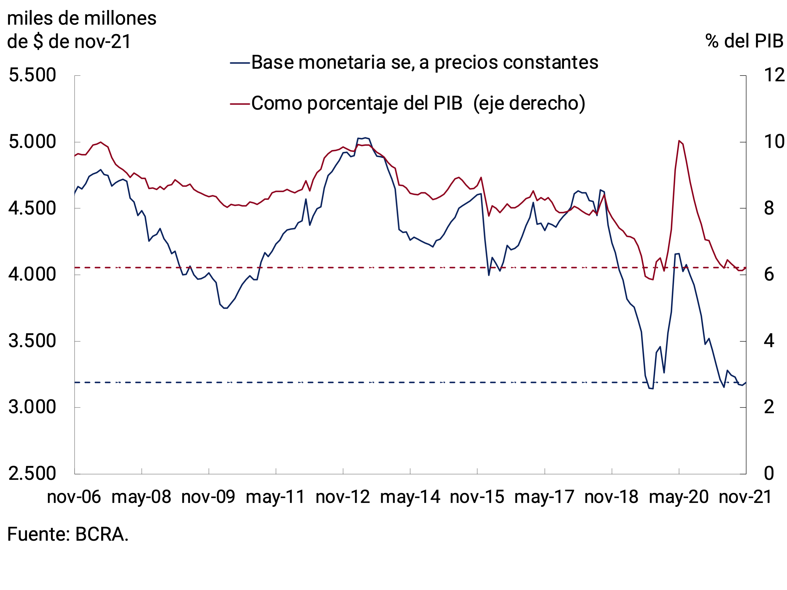 En noviembre, la Base Monetaria se ubicó en $3.148 miles de millones, lo que implicó un aumento nominal promedio mensual de 4,6% (+$138.780 millones). El principal factor de expansión fueron las operaciones del sector público. En el acumulado a noviembre estas representaron el 2,2% del PIB, menos de la mitad de lo registrado en el primer año de la pandemia y menor a la del período 2015-2017 (ver Gráfico 4.1). Ajustada por estacionalidad y por la inflación esperada del mes, la Base Monetaria habría registrado un leve incremento. De este modo, se habría mantenido en los niveles de los meses previos, con una contracción interanual del orden del 14%. En términos del PIB la Base Monetaria se ubicó en 6,2%, un valor similar al de fines de 2019 (ver Gráfico 4.2).