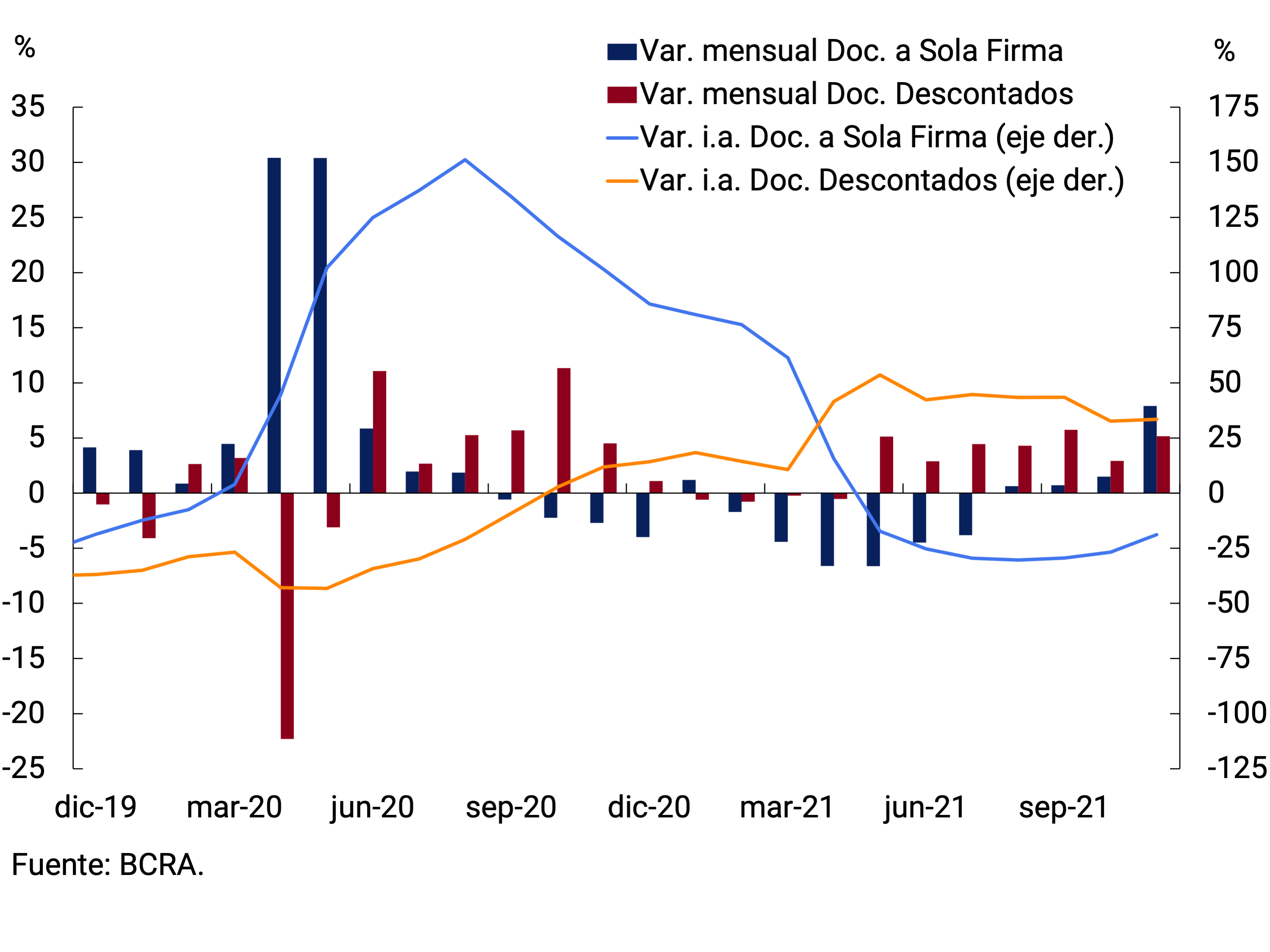 Las líneas con destino comercial habrían exhibido un crecimiento mensual cercano al 6% s.e. a precios constantes. Analizando su composición por tipo de deudor, se verifica que el crecimiento fue impulsado por ambos tipos de firmas, MiPyMEs y grandes empresas (ver Gráfico 5.3). En término de instrumentos, el mayor impulso provino de las líneas otorgadas mediante documentos, independientemente del plazo de estas financiaciones. En efecto, el crecimiento de los documentos a sola firma, que tienen un mayor plazo promedio, habría sido de 8,6% s.e. y el de los documentos descontados de 5,5% s.e., en ambos casos a precios constantes (ver Gráfico 5.4). Por su parte, el financiamiento otorgado mediante adelantos en cuenta corriente habría exhibido un aumento de aproximadamente 3% s.e. a precios constantes, el cual se explicó fundamentalmente por el otorgado a grandes empresas.