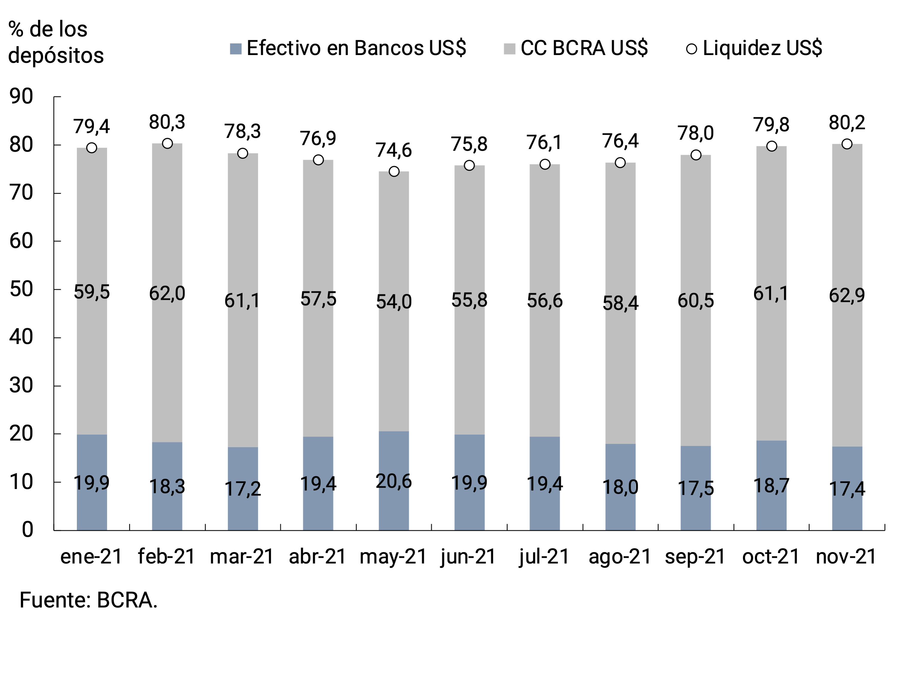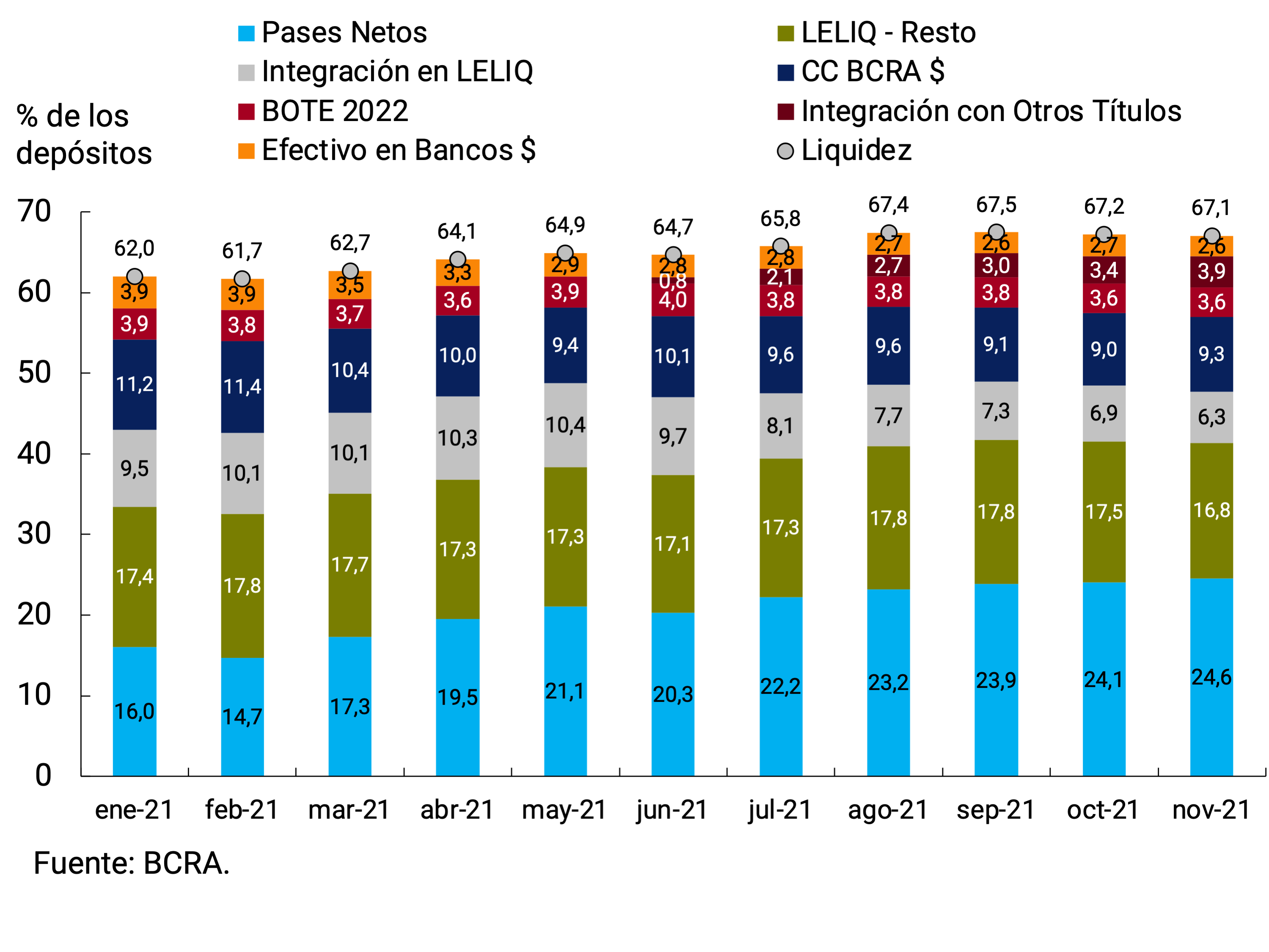 6 Incluye las cuentas corrientes en el BCRA, el efectivo en bancos, los saldos de pases netos concertados con el BCRA, las tenencias de LELIQ y los bonos elegibles para integrar encajes.