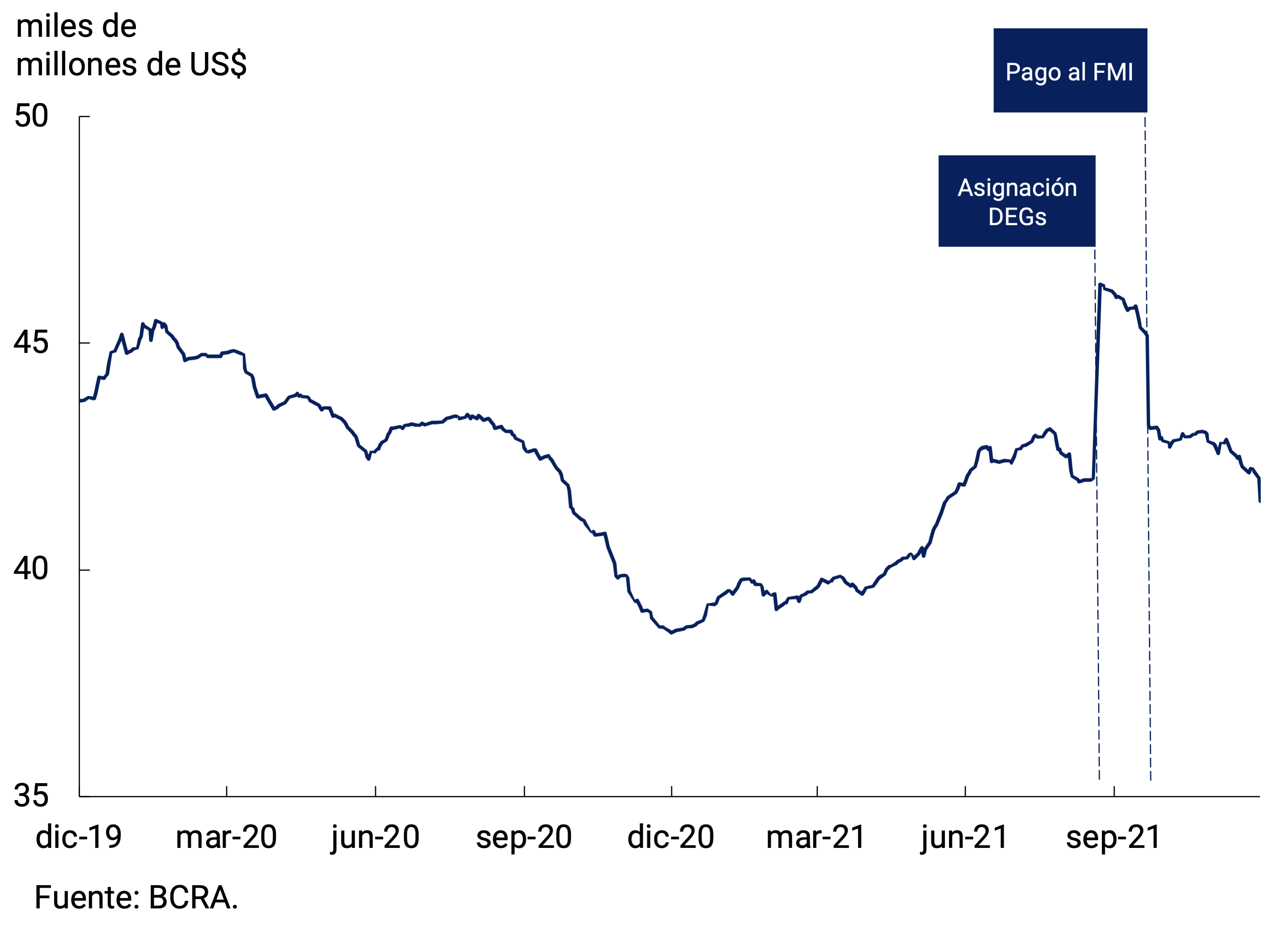 Las Reservas Internacionales del BCRA finalizaron noviembre con un saldo de US$41.530 millones, reflejando una caída de US$1.288 millones respecto al término de octubre (ver Gráfico 7.3). En cuanto a los factores de variación, esta caída se explicó por las ventas netas de divisas al sector privado, la disminución de la posición de efectivo mínimo y los pagos a organismos internacionales. Entre estos últimos, se destaca un pago de intereses al FMI a principios de mes por aproximadamente US$400 millones.