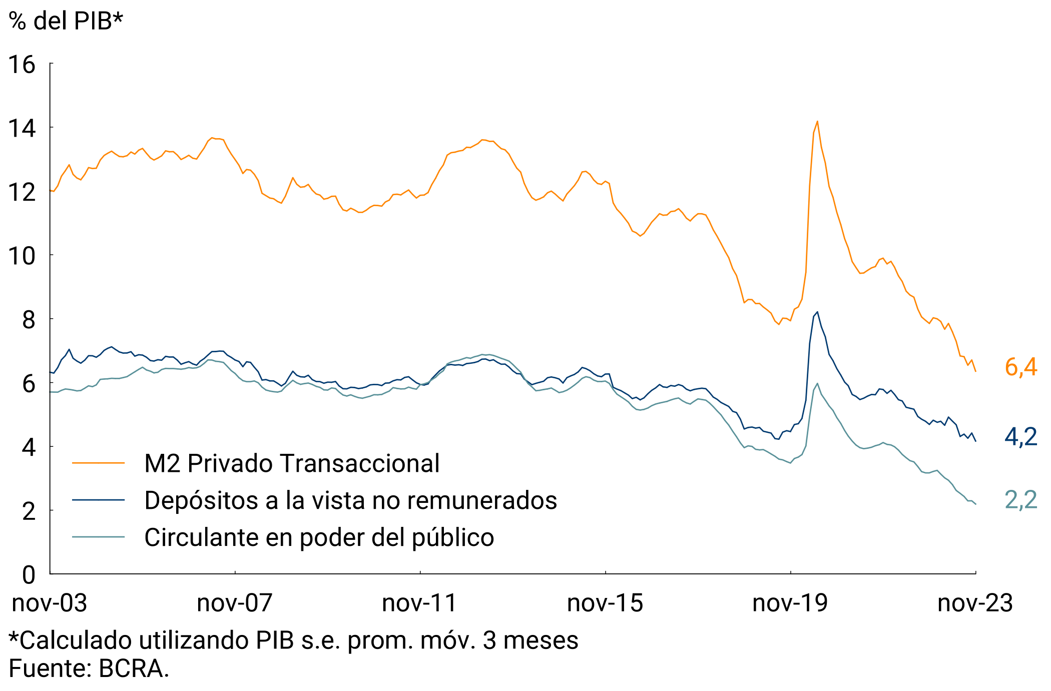 En términos reales y ajustados por estacionalidad (s.e.), los medios de pago (M2 privado transaccional1), habrían registrado en noviembre una disminución de 8,6%, marcando la mayor contracción mensual de los últimos 20 años. Esta dinámica obedeció tanto al comportamiento del circulante en poder del público como de los depósitos a la vista no remunerados (ver Gráfico 2.1). Así, el M2 privado transaccional acumularía una caída del orden del 25,5% en el año. En la comparación interanual, y a precios constantes, se ubicaría 24,2% por debajo del nivel de noviembre de 2022. Como ratio del Producto, los medios de pago alcanzaron un nuevo mínimo histórico y se situaron en 6,4%, exhibiendo un descenso de 0,4 p.p. respecto al mes previo (ver Gráfico 2.2). A nivel de los componentes, el circulante en poder del público se ubicó en 2,2% en términos del PIB, mientras que los depósitos a la vista representaron un 4,2%, nivel similar a los de mediados de 2019. En ambos casos, estos registros corresponden a los mínimos de los últimos 20 años.