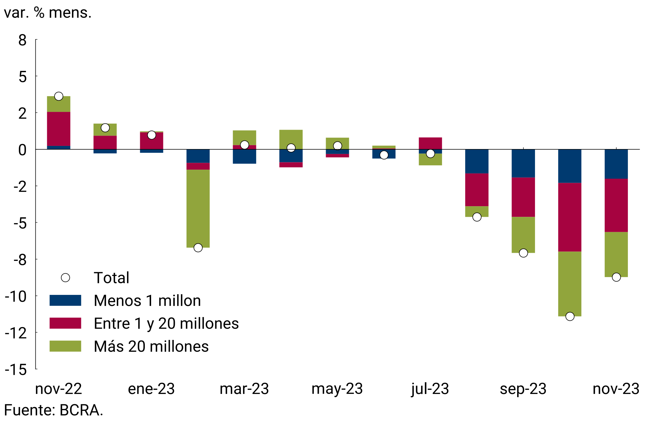 Analizando la evolución de las colocaciones a plazo por estrato de monto, a precios constantes, se verifica un descenso generalizado de todos los segmentos a lo largo del mes (ver Gráfico 3.1). Los depósitos de menos de $1 millón disminuyeron a un ritmo similar al del mes previo, anotando una caída cercana a 15,8% s.e. en términos reales. En tanto, los depósitos de más de $1 millón recortaron su ritmo de caída con respecto a octubre. En particular, los segmentos de $1 a $20 millones y de más de $20 millones habrían registrado variaciones de -9,1% s.e y -6,5% s.e. a precios constantes.