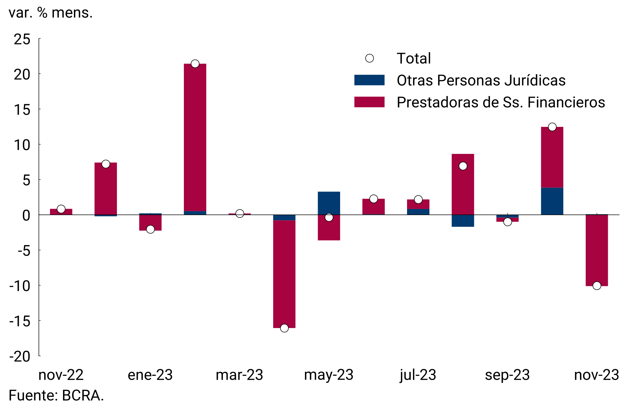 En este escenario, los depósitos a plazo fijo en pesos del sector privado en términos reales nuevamente mostraron una caída en el undécimo mes del año, aunque de menor magnitud que la de octubre. En noviembre habrían experimentado una contracción mensual de 8,7% s.e. a precios constantes y, de esta manera, acumularían una caída del orden del 32,5% en el año. Así, el saldo de este tipo de instrumentos a precios constantes se redujo hasta ubicarse en un registro similar al promedio observado entre 2010 y 2019. En igual sentido, como porcentaje del PIB se habrían ubicado en 5,5% en noviembre, lo que implicaría una disminución de 0,3 p.p. respecto a octubre.