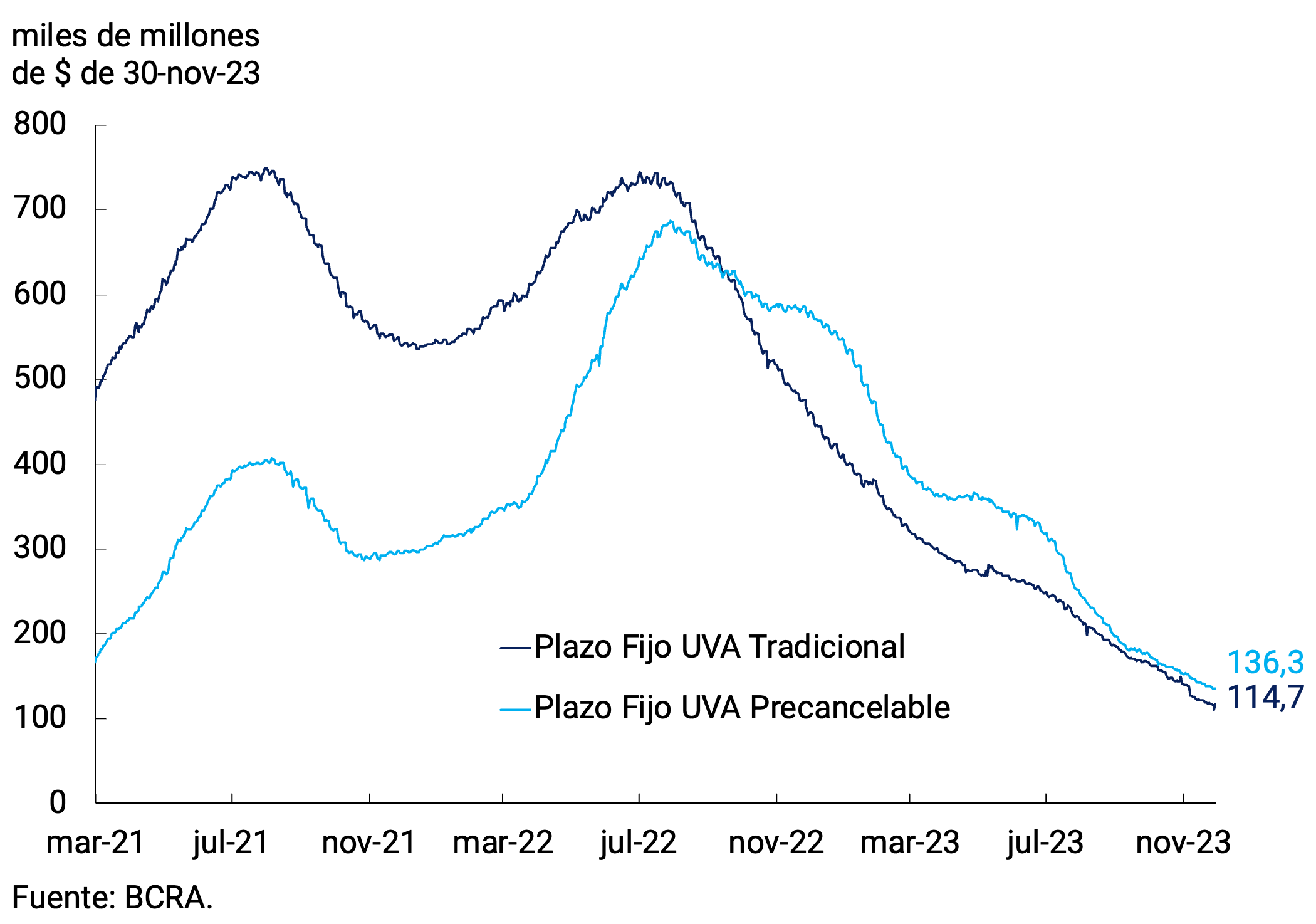 El segmento de depósitos a plazo fijo ajustables por CER continuó evidenciando una disminución en términos reales, acumulando 16 meses consecutivos de contracción. La caída se verificó tanto en las colocaciones en UVA tradicionales como en las precancelables, cuyas tasas de variación mensual fueron -18,8% s.e. y -12% s.e. respectivamente (ver Gráfico 3.3). Distinguiendo por tipo de tenedor, la disminución obedeció fundamentalmente a la dinámica de las colocaciones de personas físicas, que representan casi el 69% del total. Con todo, el saldo de los depósitos en UVA alcanzó los $248.333 millones al finalizar noviembre, lo que equivale al 1,9% del total de los instrumentos a plazo denominados en moneda doméstica.