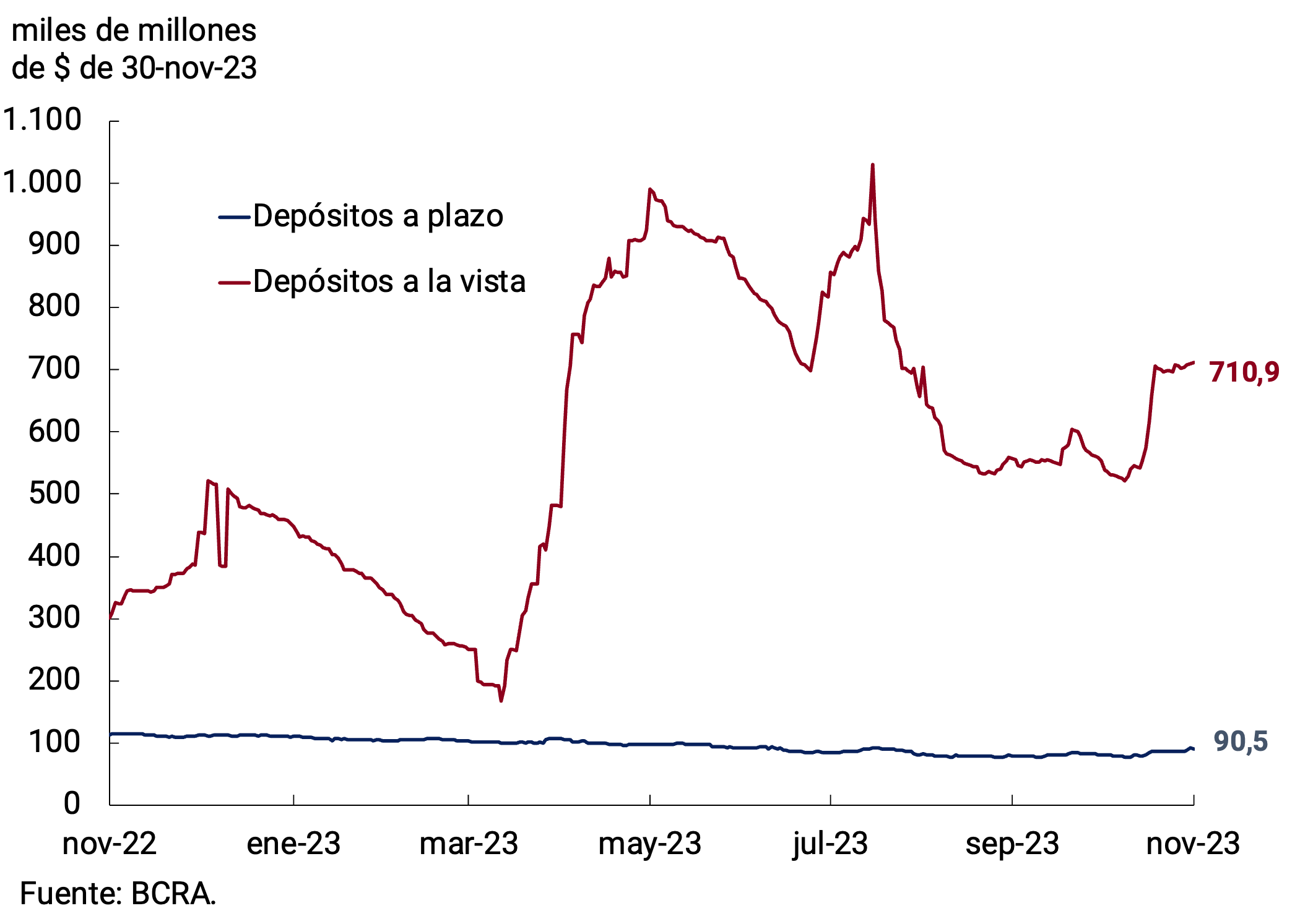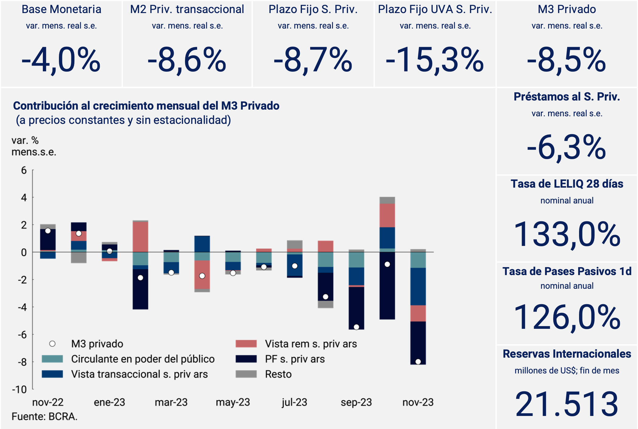 El agregado monetario amplio (M3 privado) presentó en noviembre una pronunciada contracción a precios constantes y sin estacionalidad, explicada tanto por una reducción en los medios de pago como en los instrumentos remunerados en pesos. En particular, los depósitos a plazo fijo en pesos del sector privado en términos reales y sin estacionalidad registraron una contracción de menor magnitud que en octubre, aunque todavía entre las mayores de las últimas décadas. Las mayores caídas por depositante se vieron en empresas y prestadoras de servicios financieros. Los depósitos a la vista remunerados presentaron una marcada contracción en el mes, explicados por las menores tenencias de los Fondos Comunes de Inversión de Money Market, uno de los principales actores de este segmento. Estos fondos rotaron su cartera hacia pases pasivos con el BCRA, en un contexto en el que el patrimonio se mantuvo a precios constantes sin variaciones en el mes.