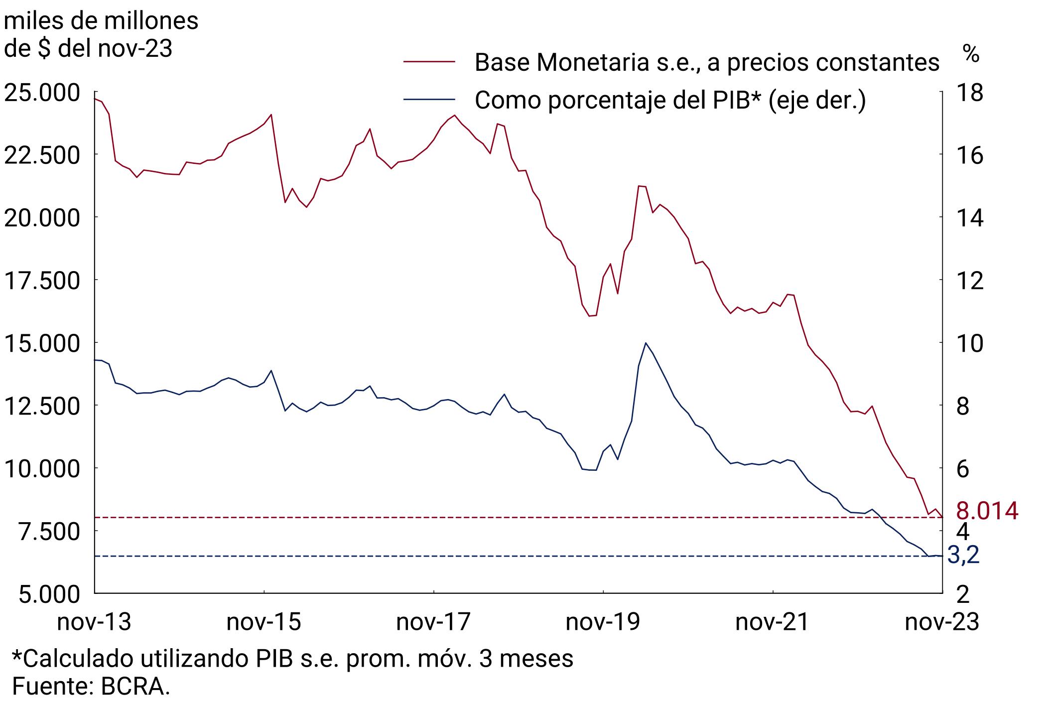 En noviembre, el saldo promedio de la Base Monetaria fue de $7.798 miles de millones, lo que implicó una expansión mensual de 8,3% ($595 mil millones) a precios corrientes. No obstante, ajustada por estacionalidad y a precios constantes habría exhibido una contracción de 4,0%, acumulando en los últimos doce meses una caída del 34,6%. Como ratio del PIB, la Base Monetaria se ubicaría en 3,2%, manteniéndose prácticamente sin cambios respecto a octubre y ubicándose entre sus valores más bajos desde la salida de la convertibilidad (ver Gráfico 4.1).