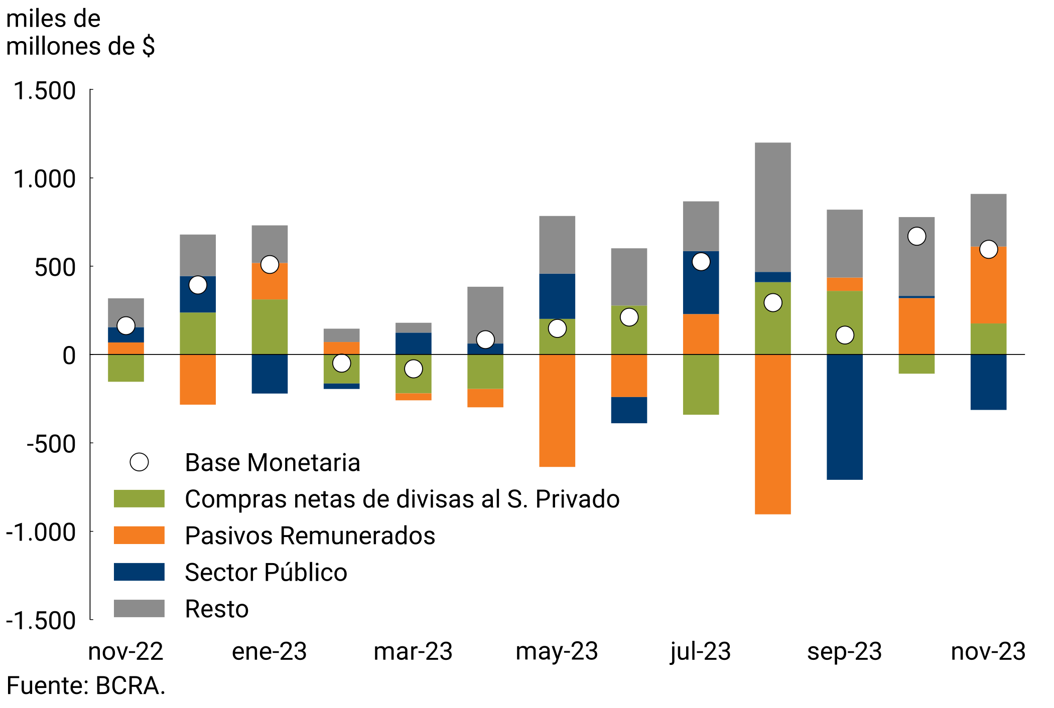 Por el lado de la oferta de Base Monetaria, la mayoría de los factores de variación fueron expansivos. Los pasivos remunerados del BCRA generaron una expansión de la liquidez. Las operaciones con títulos públicos en el mercado secundario y las ejecuciones de los contratos de opciones de venta (put option) sobre títulos del Gobierno Nacional por parte de entidades financieras también generaron una expansión monetaria, al igual que la compra neta de divisas al sector privado. En tanto, las operaciones del sector público tuvieron un efecto contractivo en promedio en noviembre (ver Gráfico 4.2).