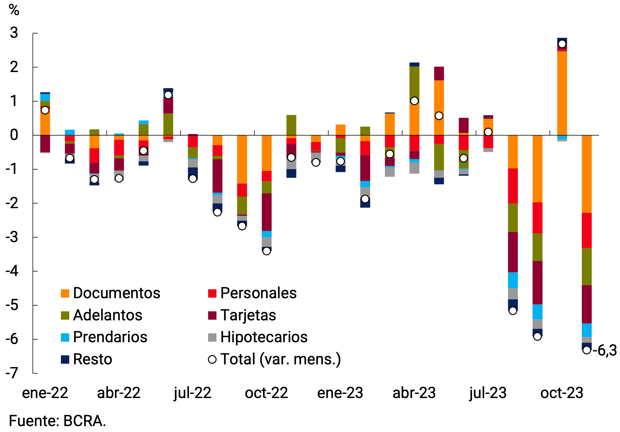 Las líneas comerciales habrían mostrado la mayor disminución, con una caída mensual de 7,7% s.e. en términos reales y se ubicarían 8,3% por debajo del registro de un año atrás. A nivel de los instrumentos, los préstamos otorgados mediante documentos se habrían contraído en noviembre 7,2% s.e. y se encontrarían 3,7% por encima de su nivel de un año atrás. Al interior de estas líneas, los documentos a sola firma, de mayor plazo promedio, habrían registrado una disminución de 6,5% s.e. En tanto, los documentos descontados habrían caído 7,7% s.e. en el mes. Por su parte, los adelantos se habrían contraído 10,5% s.e., y se encontrarían 28,0% por debajo del nivel de noviembre de 2022.