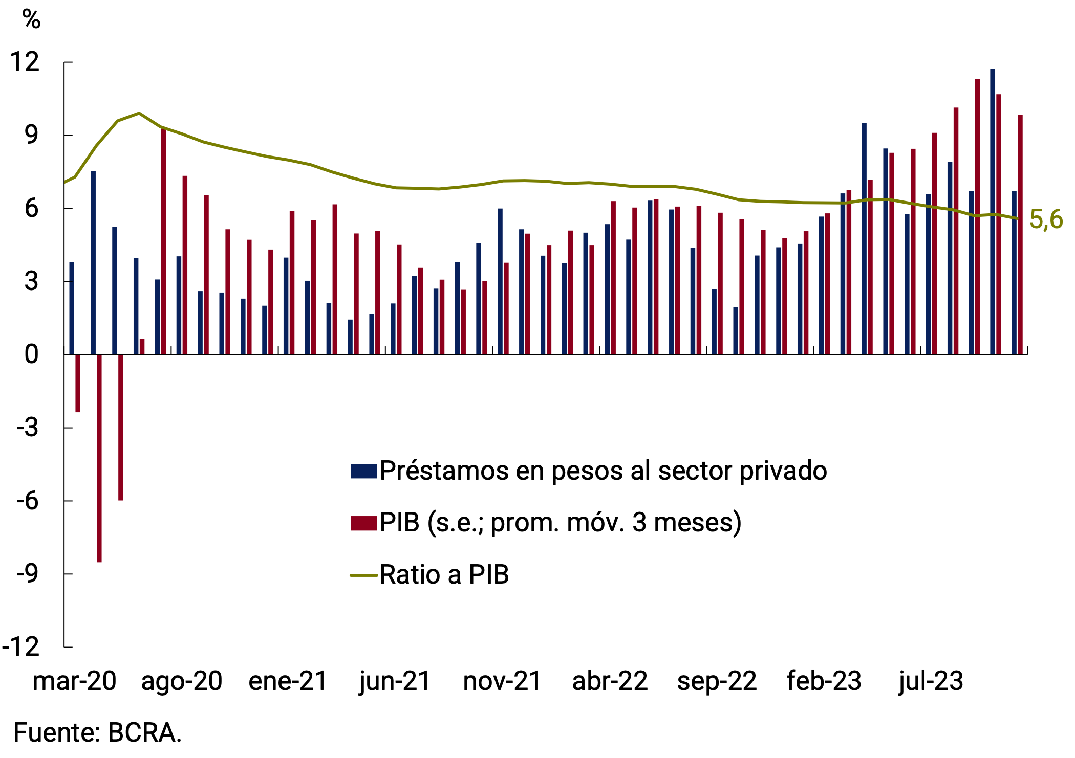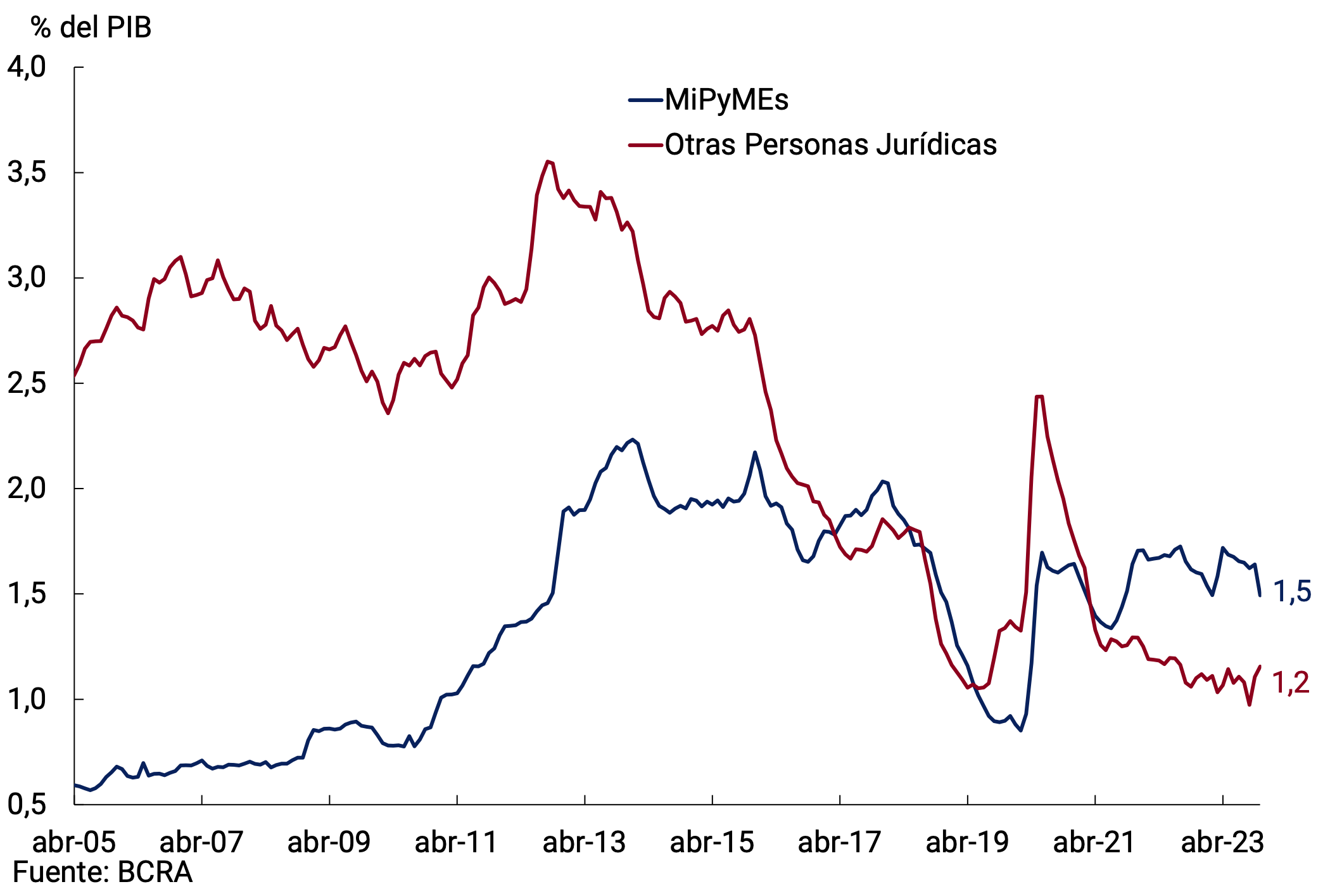 Por su parte, los préstamos en pesos al sector privado registraron una contracción a precios constantes y sin estacionalidad, que resultó generalizada a nivel de las grandes líneas de crédito. De este modo, el crédito a PIB se ubica en niveles mínimos de los últimos 20 años.