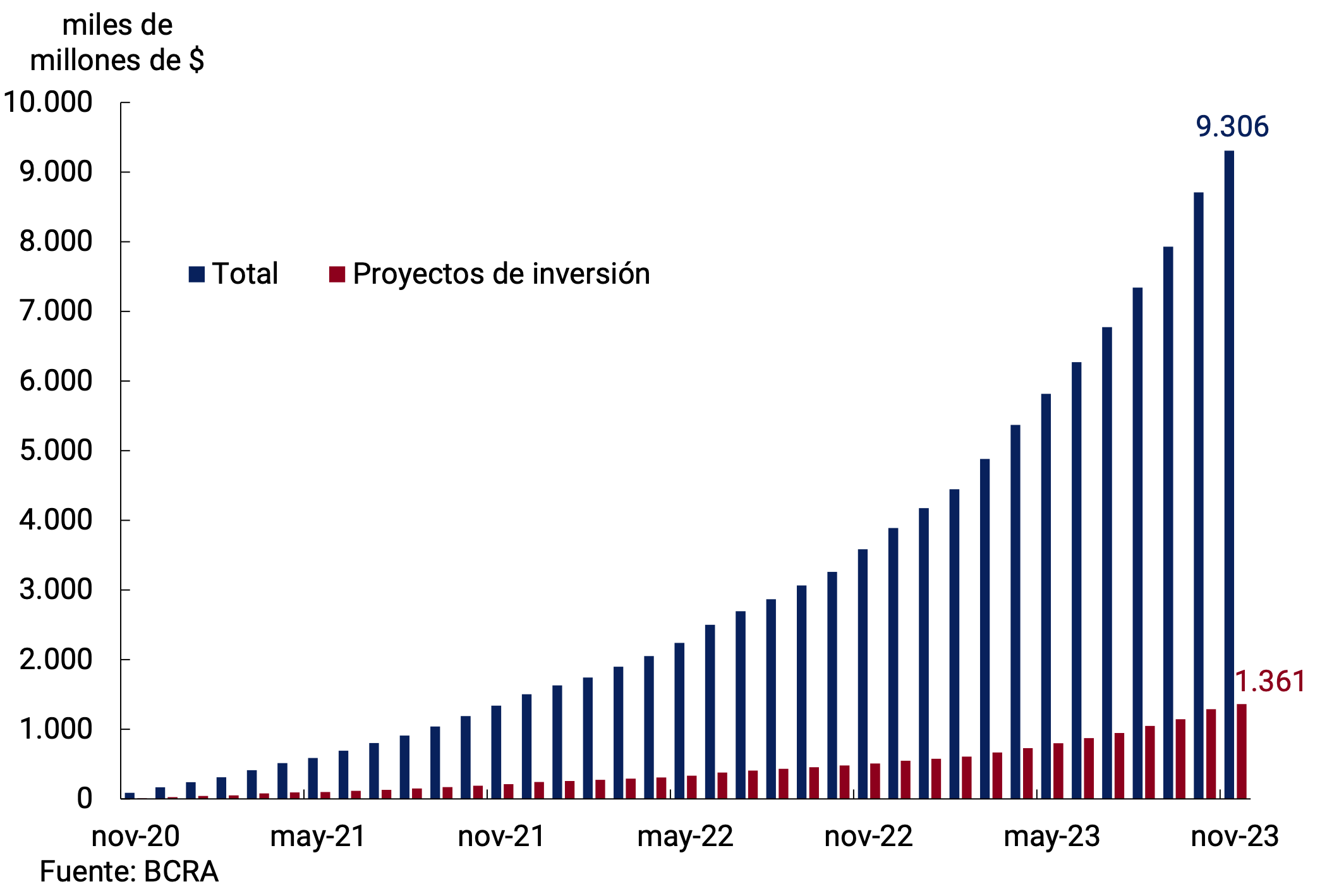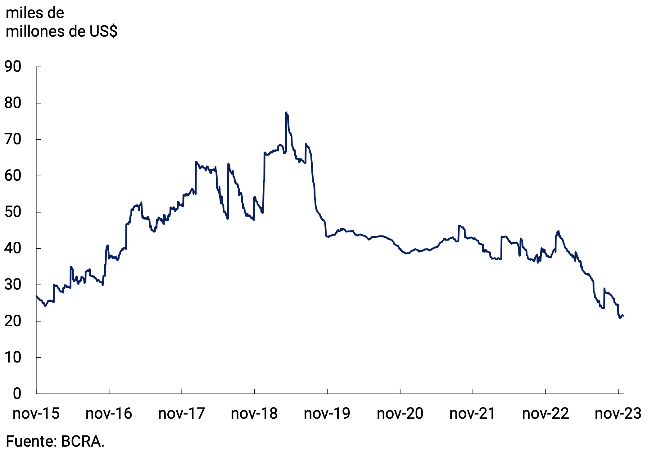 En el mes tuvieron lugar algunas modificaciones normativas en materia cambiaria, entre las que es posible mencionar la flexibilización de los requisitos para los clientes que accedan al mercado de cambios para realizar pagos de servicios a no residentes siempre que cumplan ciertas condiciones mencionadas en la normativa7. También se llevaron a cabo modificaciones relacionadas con los ingresos por el mercado de cambios provenientes de la venta de activos no financieros8. Por otro lado, la Administración Federal de Ingresos Públicos (AFIP) aumentó del 45% al 100% la percepción del impuesto a las ganancias que se aplica sobre las operaciones alcanzadas por el Impuesto PAIS. De esta manera, el recargo total en el valor del tipo de cambio por compras y gastos en el exterior pasó a ser, desde el 22 de noviembre, 155% (30% impuesto PAIS, 25% percepción bienes personales y 100% percepción ganancias)9.